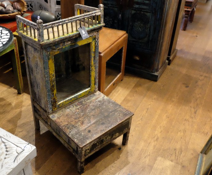 Alter, bunter Altarkasten mit einer Glastür, schöne Patina. Oben mit einer Ablage versehen, Unikat aus Indien.