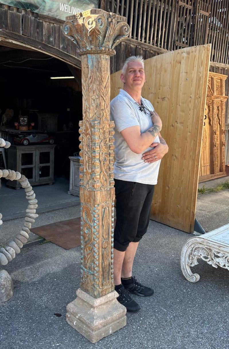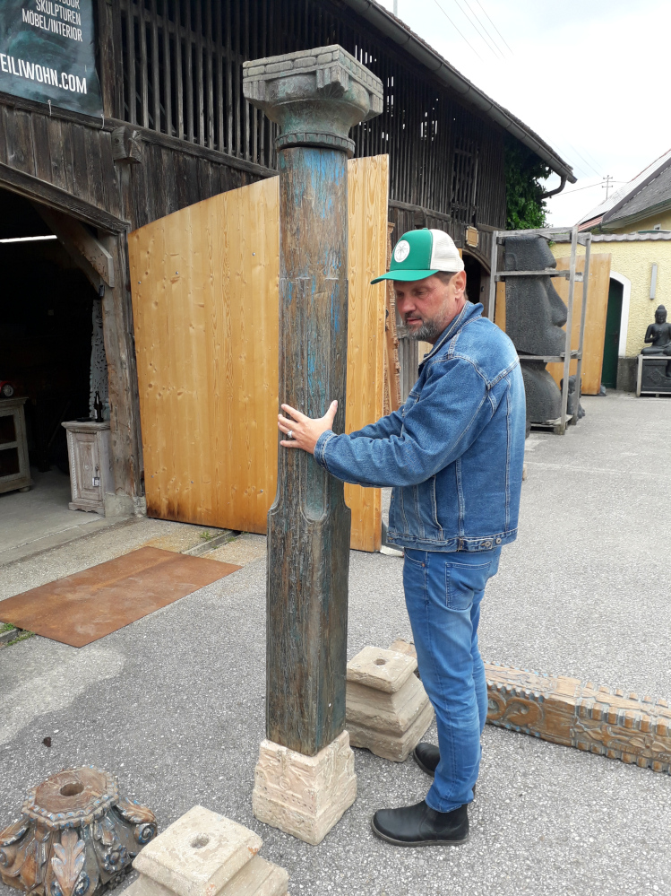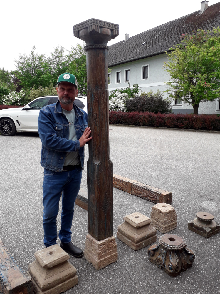 Neu eingetroffen: Alte Säulen, der Schaft aus massivem Holz, der Sockel aus schwerem Stein, das Kapitell handgeschnitzt, jedes Stück ein Unikat aus dem Norden Indiens!