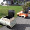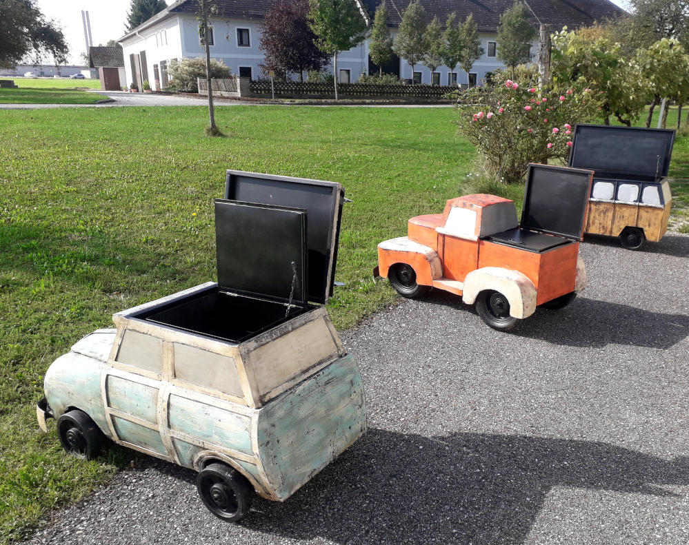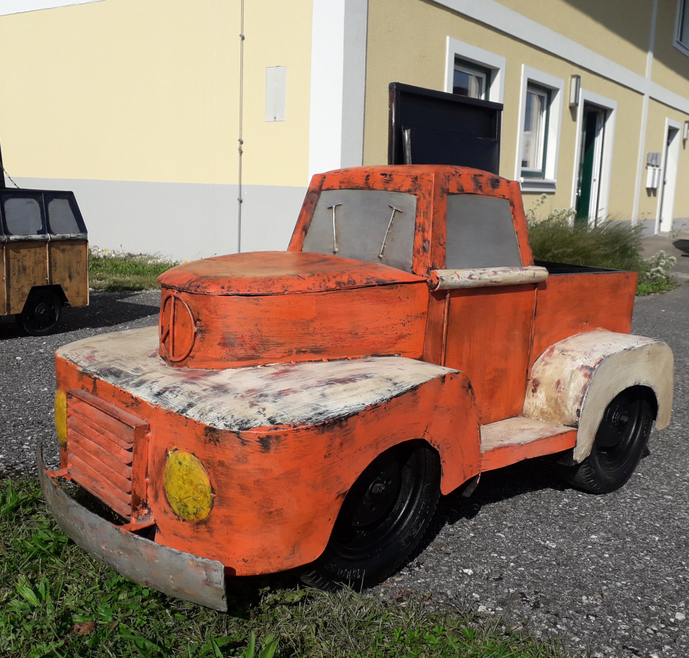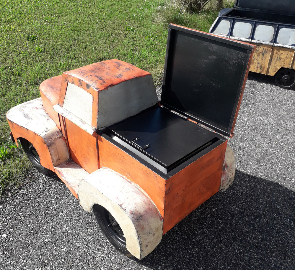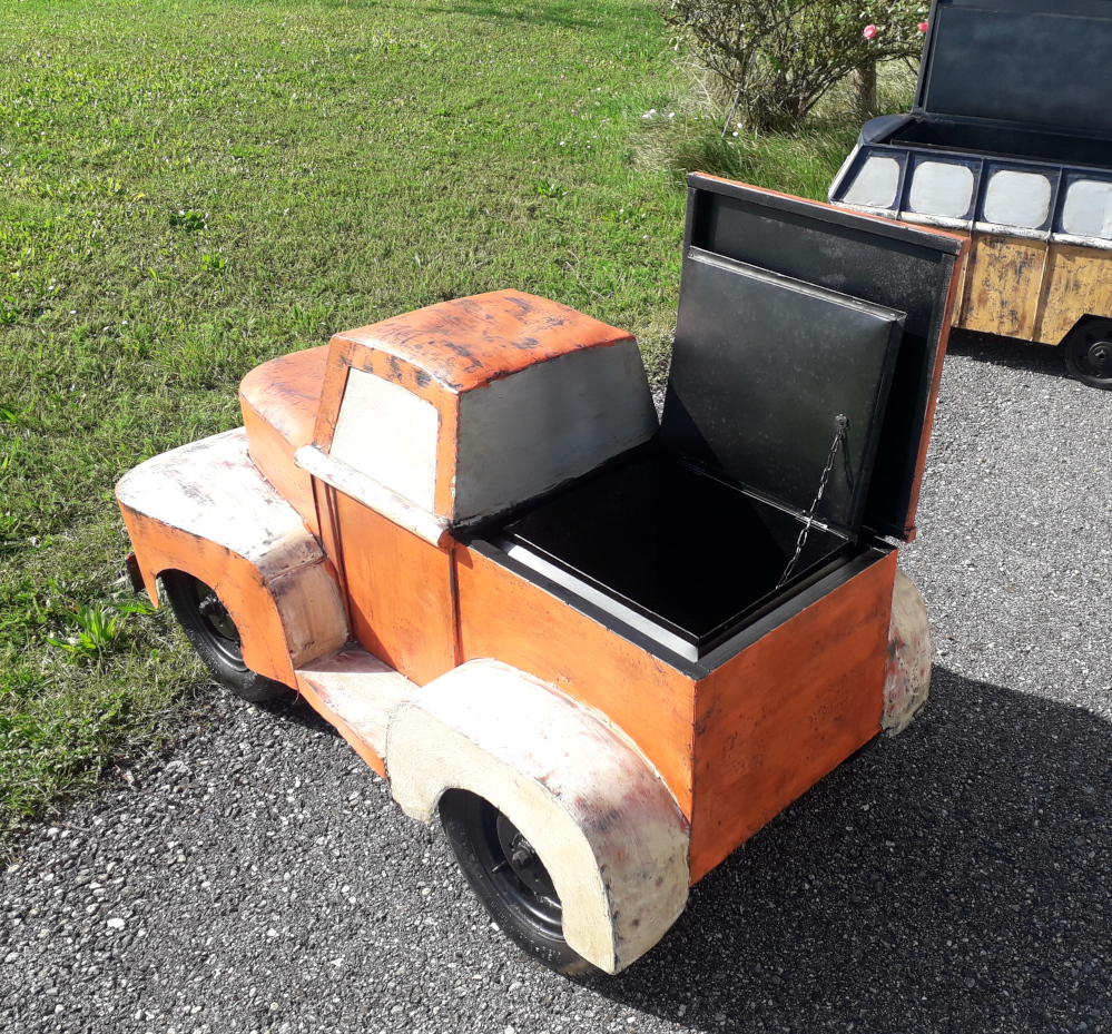 Handgearbeitet und -geschmiedet, das zu öffnende Dach und die Motorhaube verbergen ein Geheimfach, daher gut als Kühlbox oder für Schätze aller Art, rollbare Gummiräder, ideal für jeden Man’s Cave!