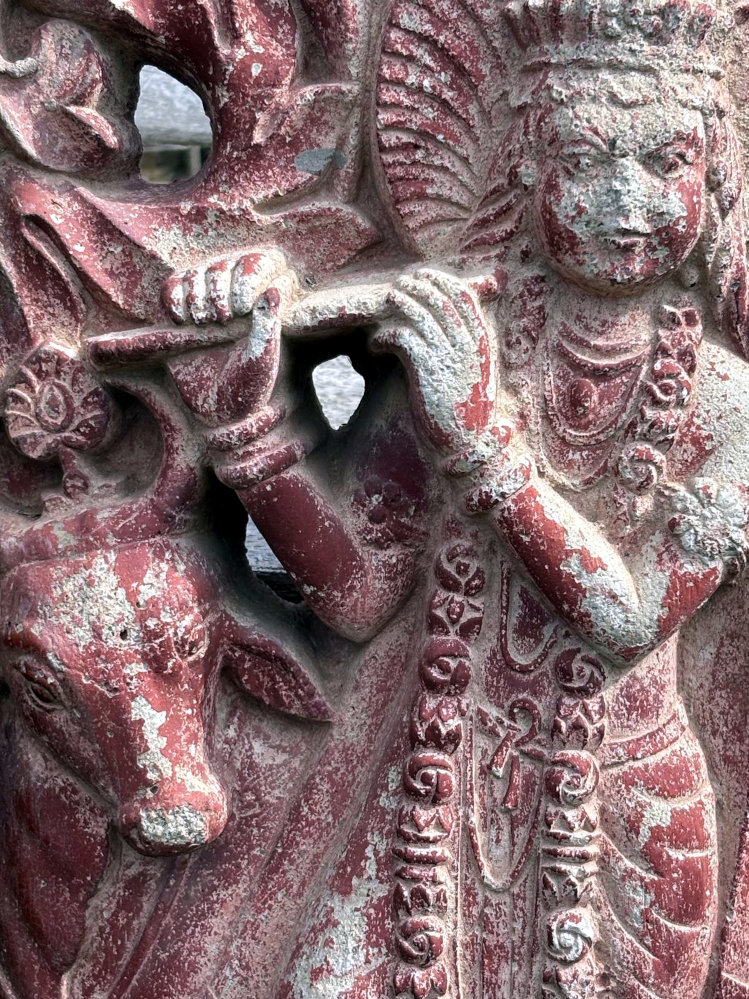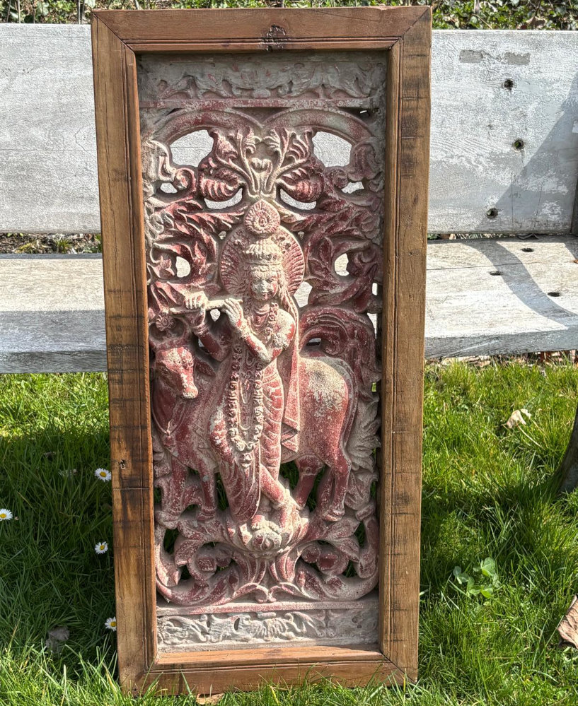 Dieses alte Relief aus Indien zeigt den Flöte spielenden Shiva vor seinem Reittier, der heilige Kuh Nandi, seltene Darstellung, eingebettet in massivem Holzrahmen, wunderschöne Wanddekoration, unter Dach auch für Outdoor!