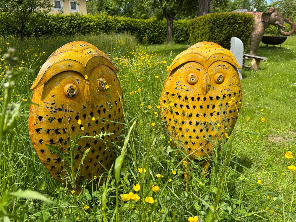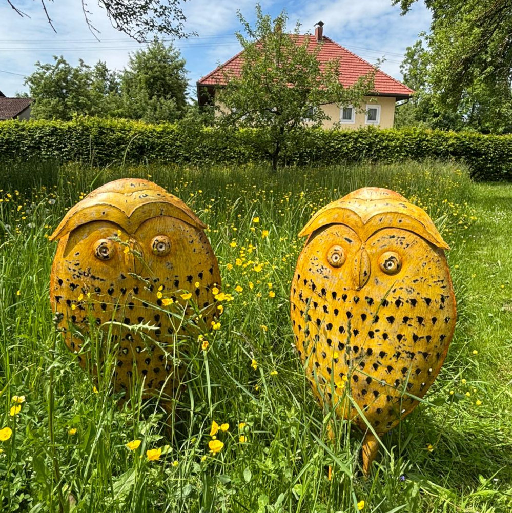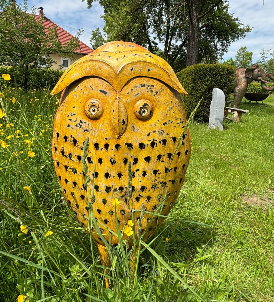 Handgefertigte große Eule aus Eisen, schön dunkelgelb bemalt, tolle Zier für Haus, Garten und alle Historiker!