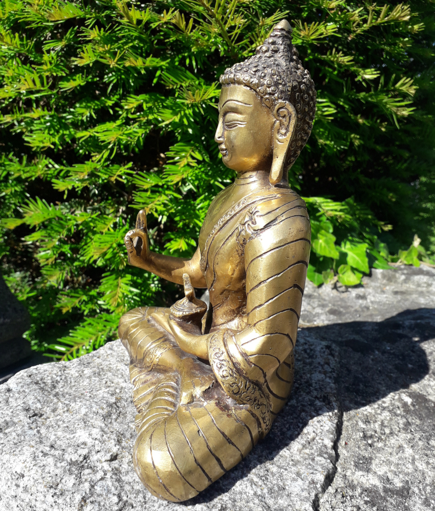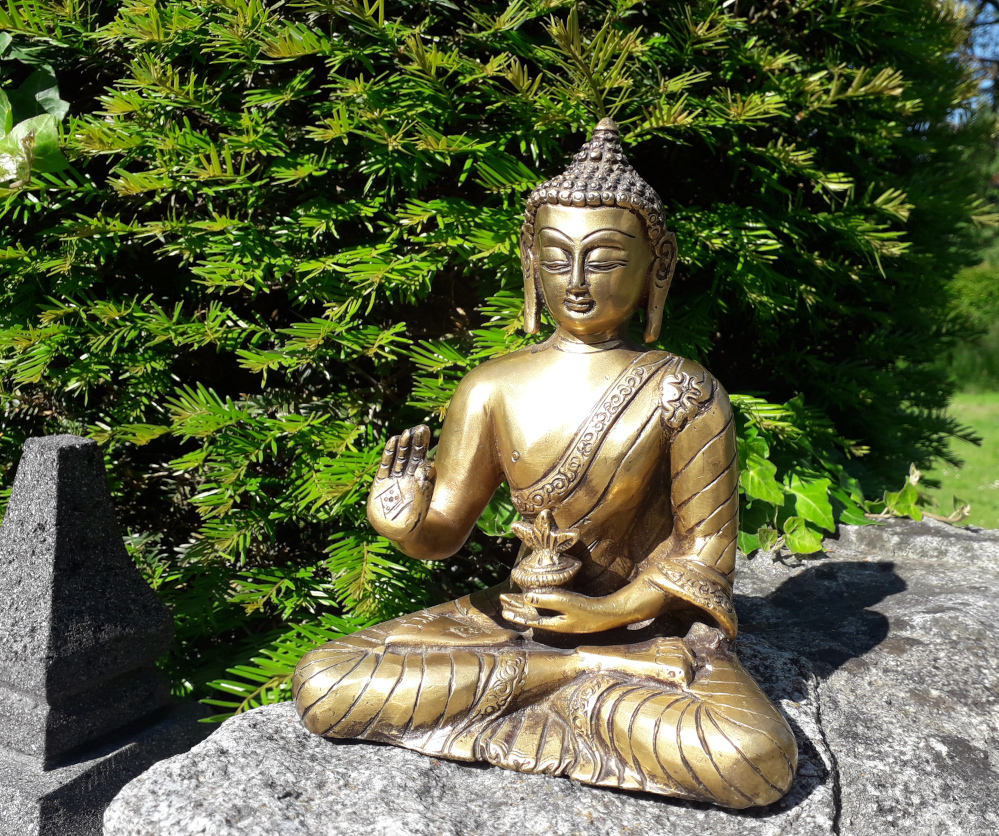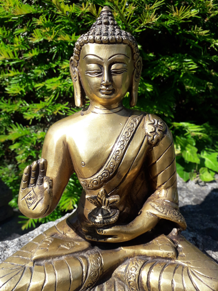 Der schützende Buddha: Buddha mit der Abhaya Mudra Handhaltung zeigt die Geste des Grußes und der Schutzgewährung, sie wehrt Furcht ab und läßt Glückseligkeit zuteil werden.