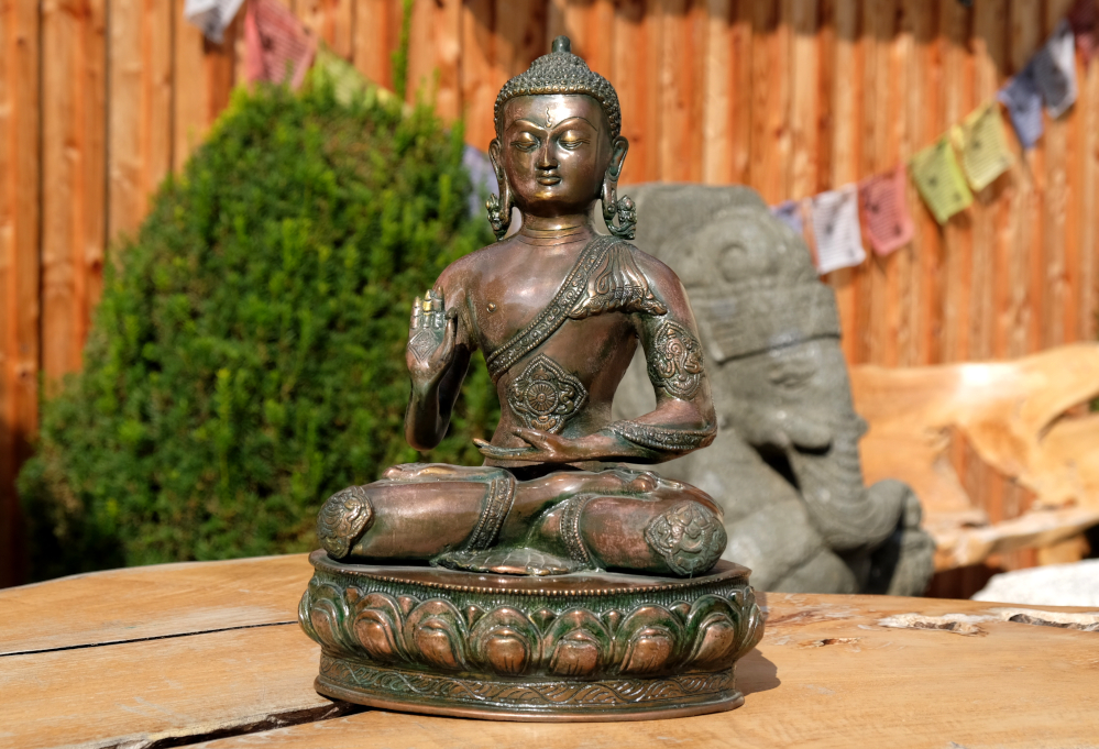 Sitzender Buddha mit der Mudra der Lehre (Dharmachakramudra). Glänzend polierter Bronzeguss. Ein Unikat.
