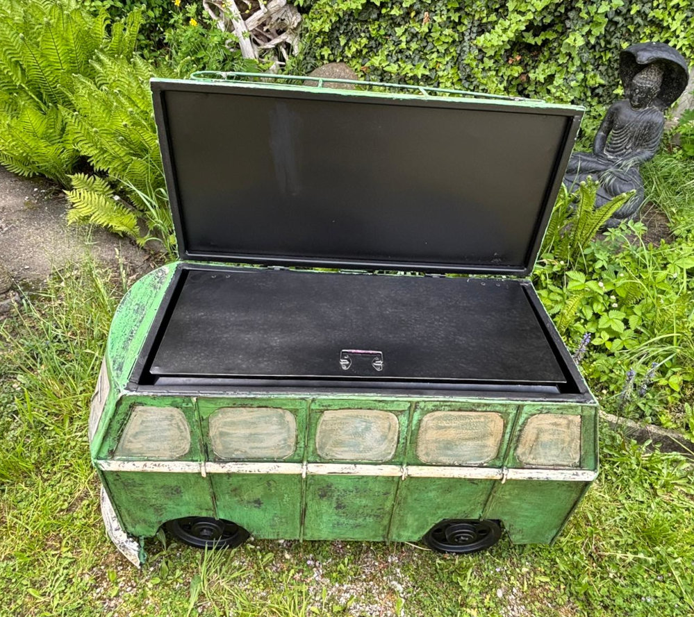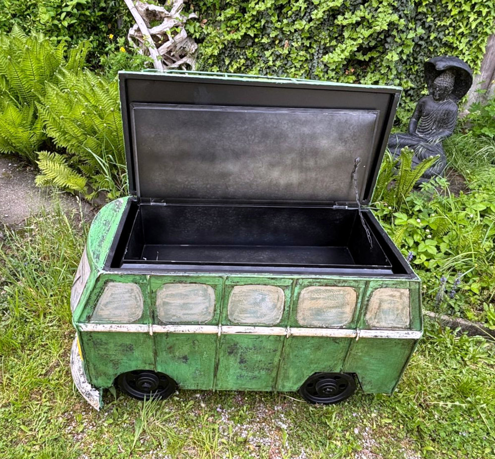 Handgearbeitet und -geschmiedet, das zu öffnende Dach verbirgt ein Geheimfach für Schätze aller Art, rollbare Gummiräder, ideal für jeden Man’s Cave!