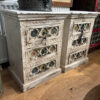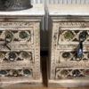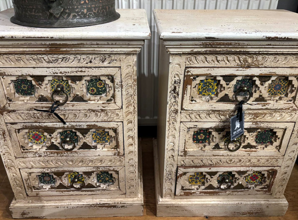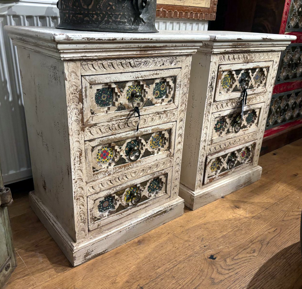 Praktische kleine Kästchen aus Indien, ideal z.B. als Nachtkästchen, mit drei Laden und bunten eingelegten fröhlichen Porzellanplättchen!