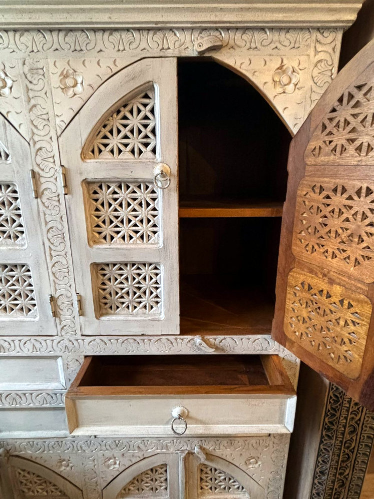 Neu eingetroffen: Breiter Schrank mit 8 Türen und 4 Schubladen, handgeschnitzte Muster verzieren die Türen und Rahmen, dekoratives Unikat aus Indien!