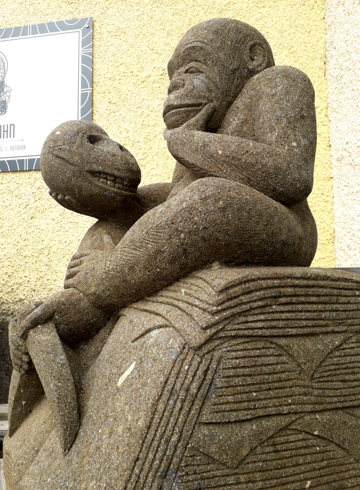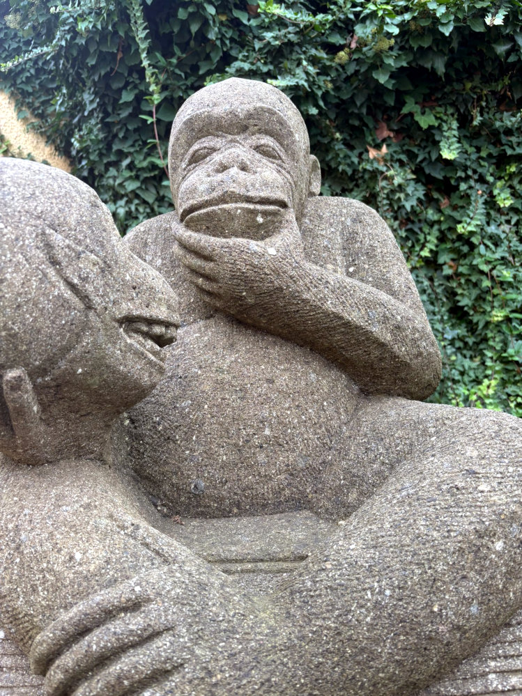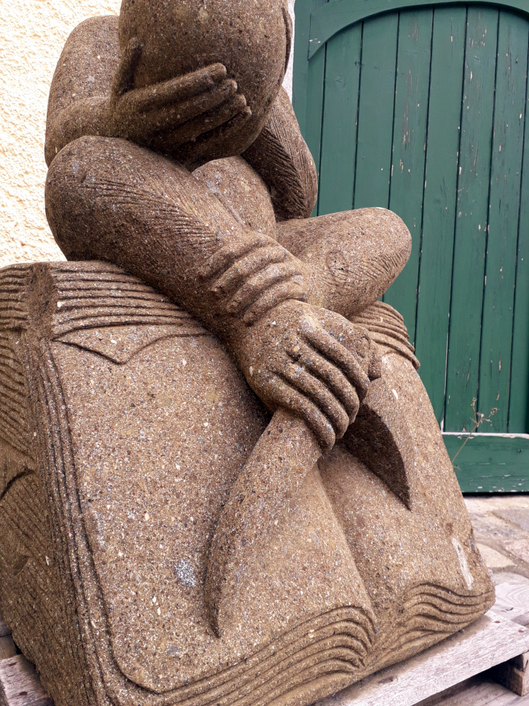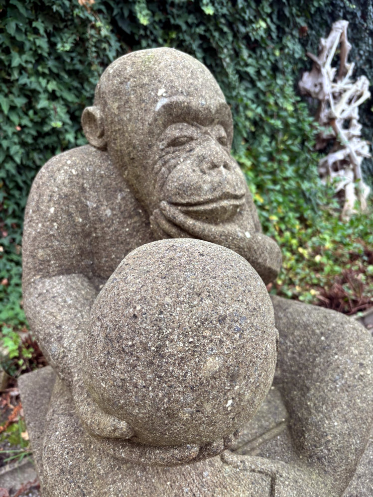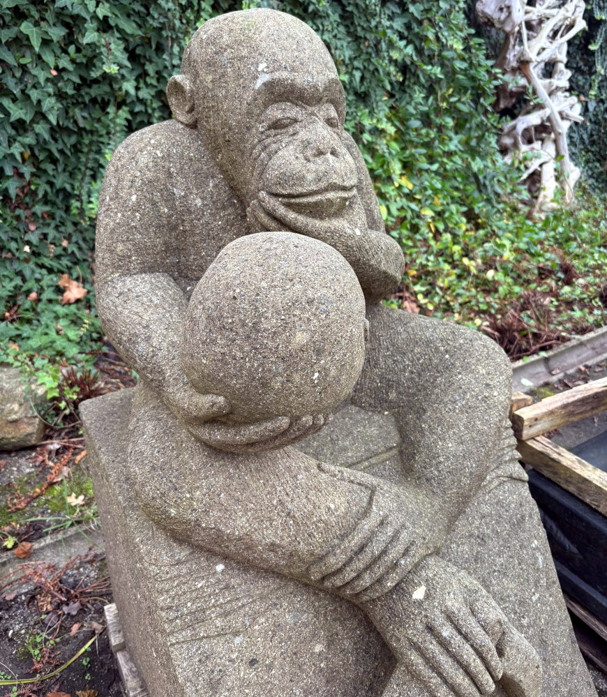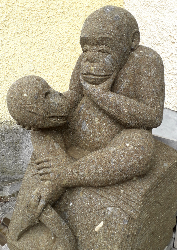Über den Sinn des Lebens grübelnder Affe: Er sitzt auf der Weisheit – versinnbildlicht mit einem Bücherstapel, mit den Zehen hält er einen Zirkel – als Symbol für die Wissenschaft, in der Hand einen Totenkopf – als Zeichen für die Vergänglichkeit allen Lebens, Blickfang aus Lavastein, jetzt in Aktion!