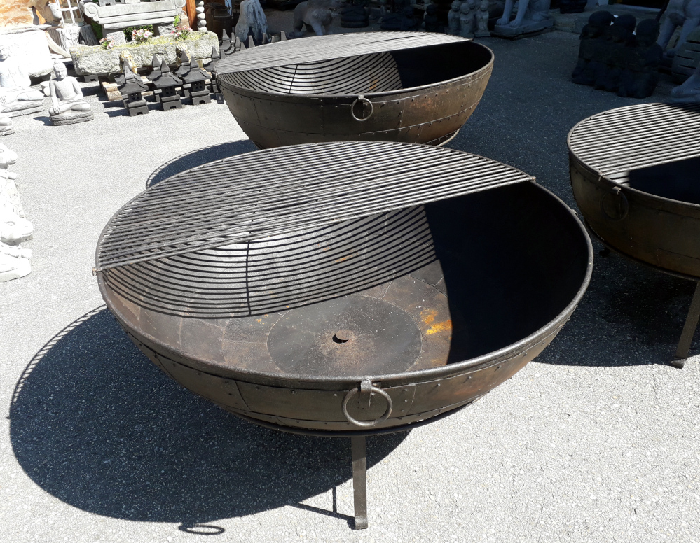 Riesige Feuerschale aus massivem Eisen, inkl. Ständer und Grillrost, handgeschmiedet und -genietet, Eyecatcher made in India!