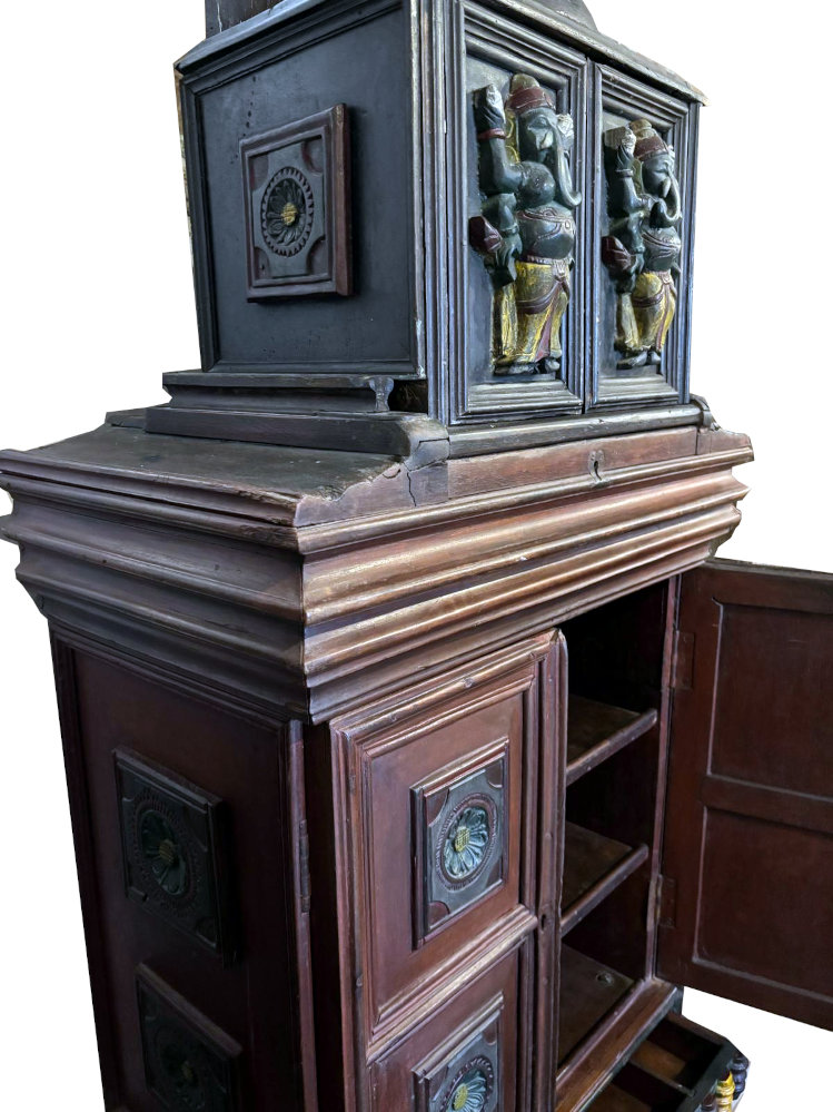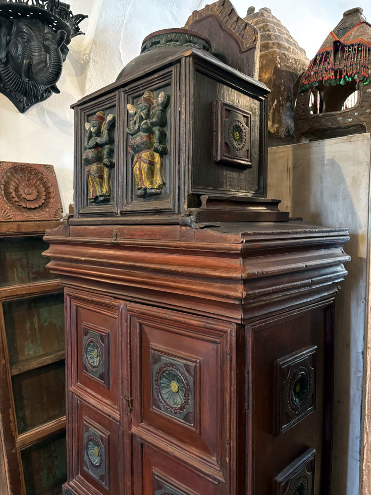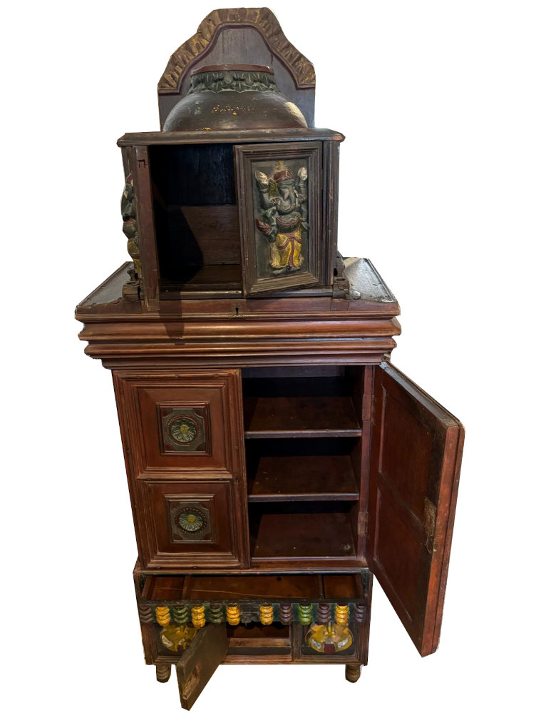 Spektakuläres Unikat aus Burma: Original Schrank und Altar in einem, verziert mit Ganesha-, Tiger- und Lotusschnitzereien, innen drei Ebenen, unter dem Altaraufsatz verbirgt sich ein Geheimfach, unten eine Lade mit vielen Fächern und darunter verbirgt eine weitere Tür mehr Stauraum, Seltenheit!