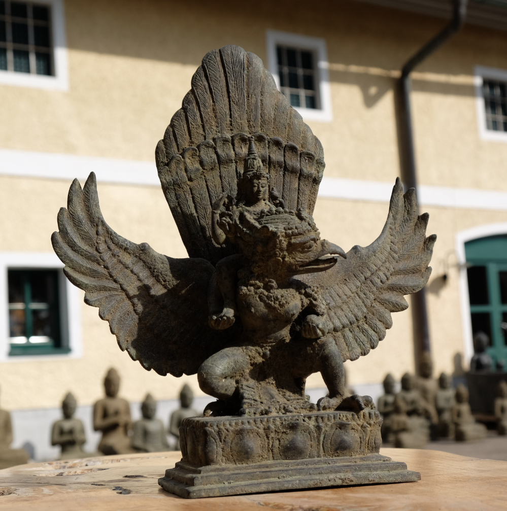 Garuda, das Reittier Vishnus und Götterbote. Er steht für Wissen, enorme Stärke und grenzenlosen Mut. Hier eine beeindruckende Darstellung aus Bronze. Antikes Sammlerstück!