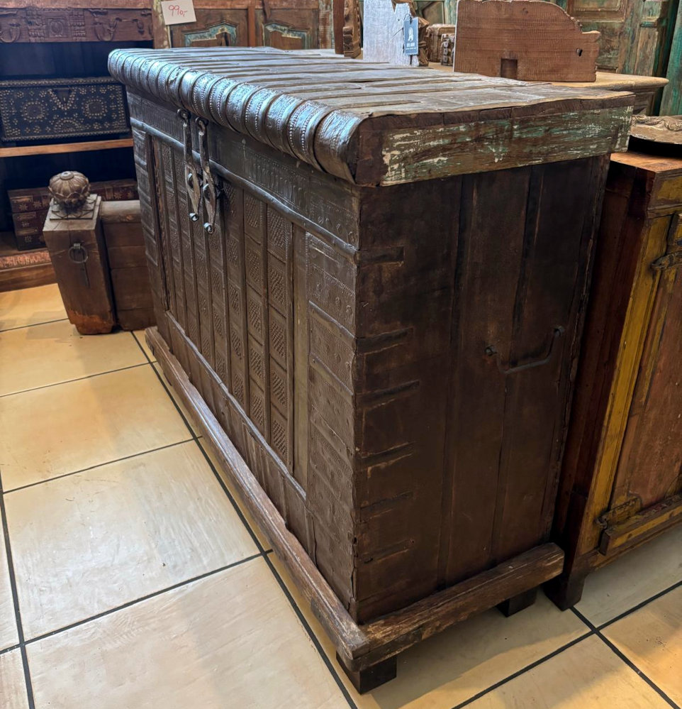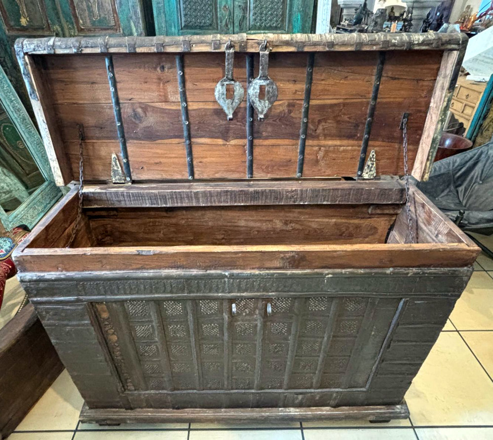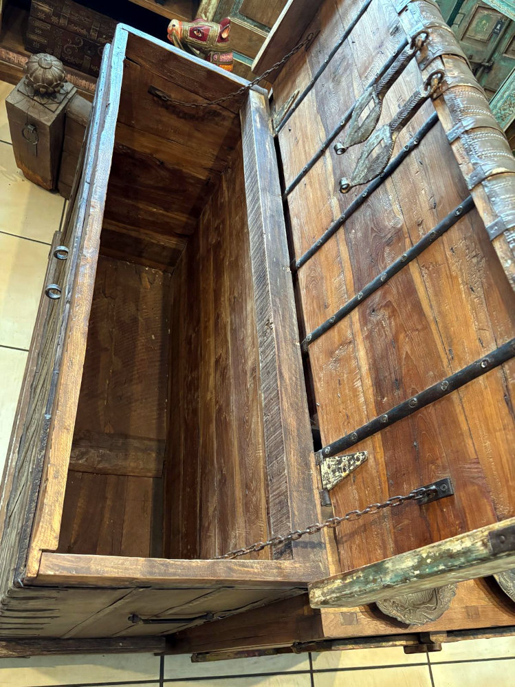 Große Truhe aus Indien, rundherum metallbeschlagen und verziert, altes Unikat, jetzt in Aktion!