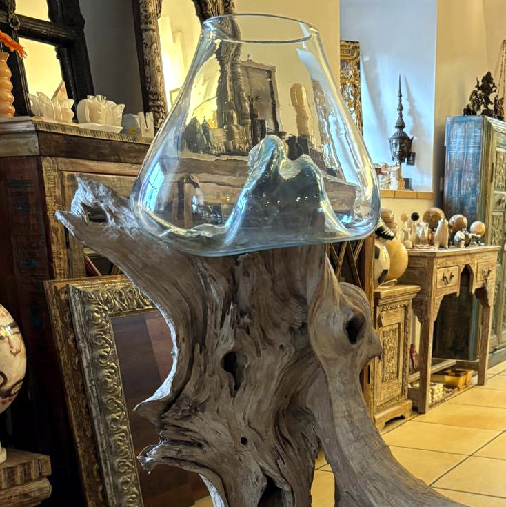 Die perfekte Mischung aus Natur und Kreativität: Mundgeblasene Vasen auf steiler Teakwurzel, ideal zum Bepflanzen oder mit Sand und Muscheln oder Räucherstäbchen zu befüllen, jedes Stück ein Unikat, Eyecatcher aus Indoneisen!