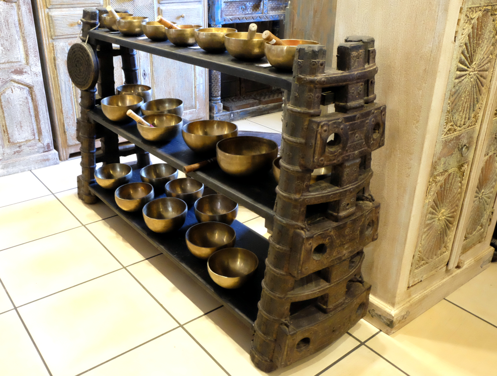Blickfang aus Indien: Großes Regal mit drei Ebenen, die massiven Seitenteile aufwendig geschnitzt und mit Metall beschlagen, Unikat!