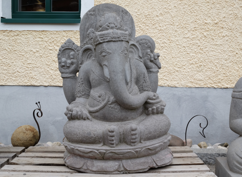 Grosser massiver Ganesha aus frostsicherem Flussstein. Detailreiche und perfekte Steinmetzkunst. Unikat und Blickfang aus Indonesien.