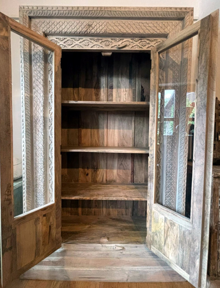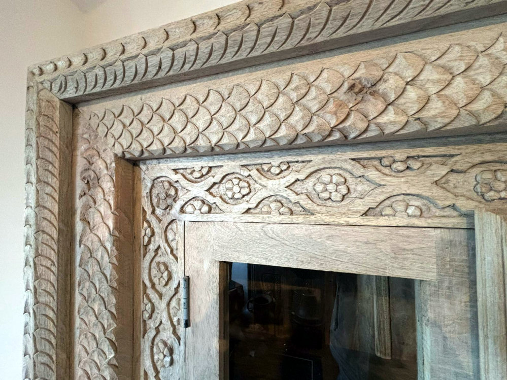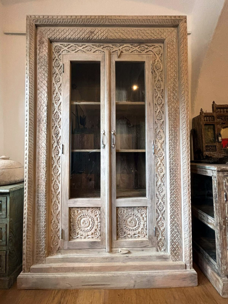 Ob seiner Größe beeindruckender Vitrinenschrank, Türen und Rahmen mit handgeschnitzten Verzierungen versehen, tolles Unikat aus Indien!