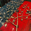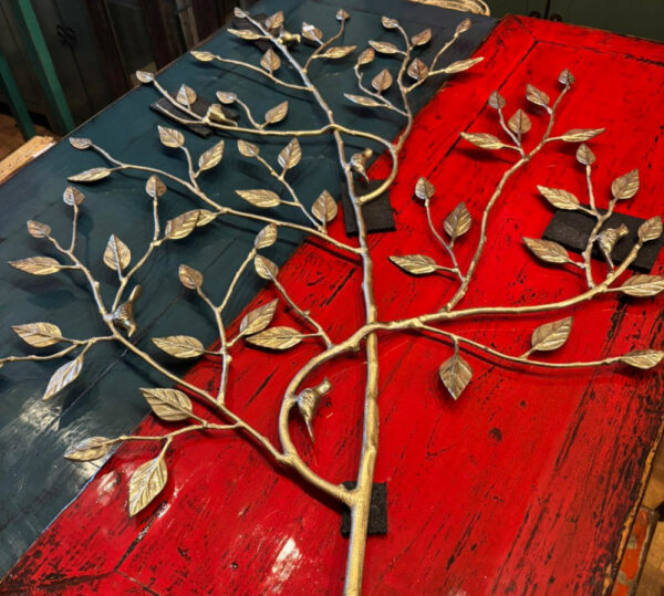 Tolle Wanddekoration aus massivem Messing: güldener Zweig mit vielen Blättern und Vögeln, Unikat aus Indien!