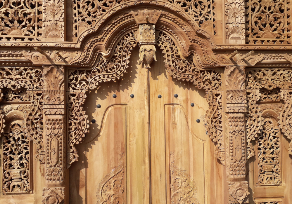 Unglaublich schönes und detailreich handgeschnitztes Tor aus Teakholz, perfekte indonesische Handwerkskunst, Unikat!