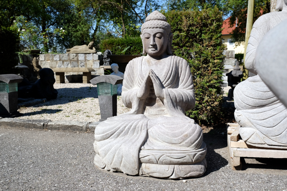 Massiver großer Buddha aus frostsicherem Flussstein. Die Hände hält er in der grüßenden Mudra, während er auf einem Lotussockel sitzt. Diese Figur strahlt Ruhe und Zuversicht aus – wichtig gerade in turbulenten Zeiten. Blickfang und Unikat aus Indonesien.
