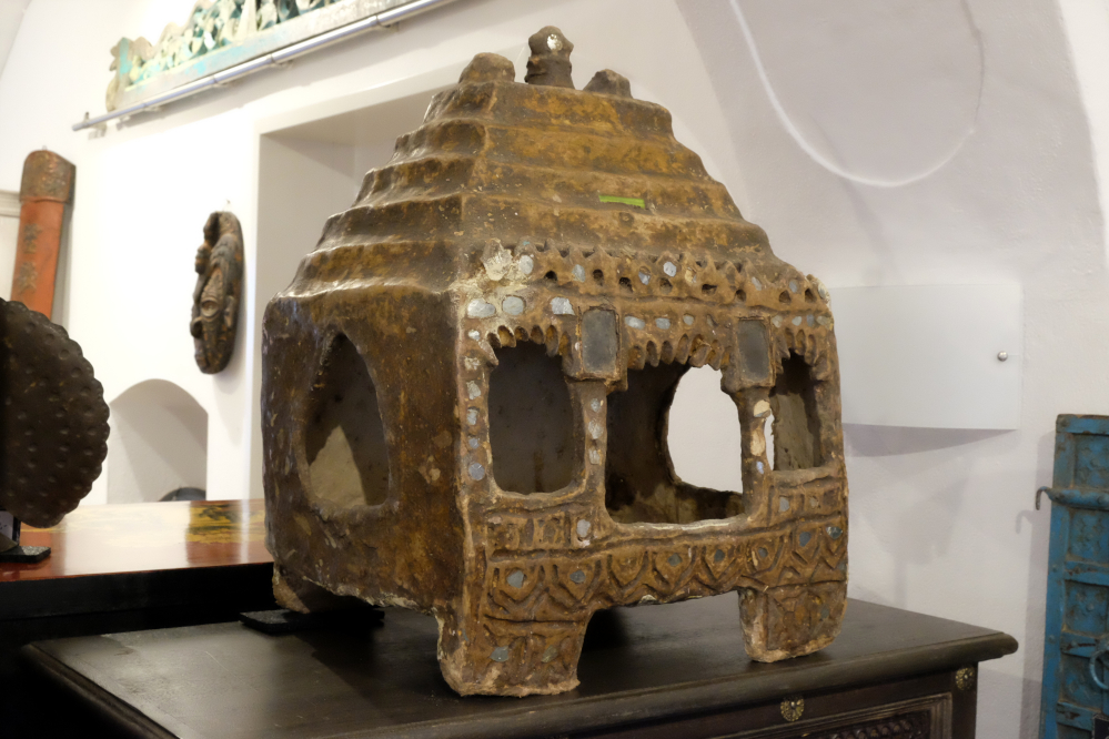 Ein besonderes Original aus der indischen Wüste Thar. Diese aus Pappmaché gebauten kleinen Häuser wurden in den Nomadenzelten als kühlende Obstschalen verwendet. Danach wurden sie als Hausaltar oder -Tempel weiterverwendet. Ein unglaublich dekoratives, handgearbeitetes, mit Spiegelelementen besetztes Unikat aus Indien mit Geschichte.