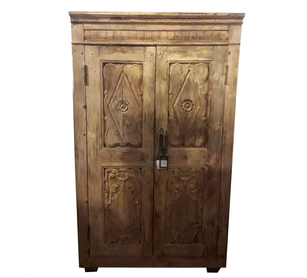 Hellbrauner Schrank aus Indien. Handgeschnitzte Elemente zieren die Türen. Unikat.