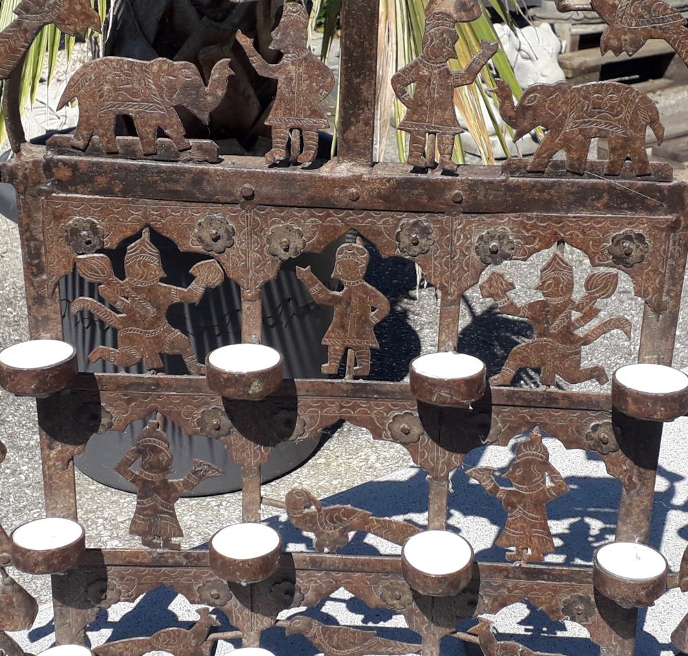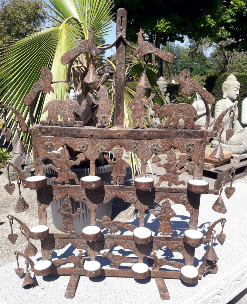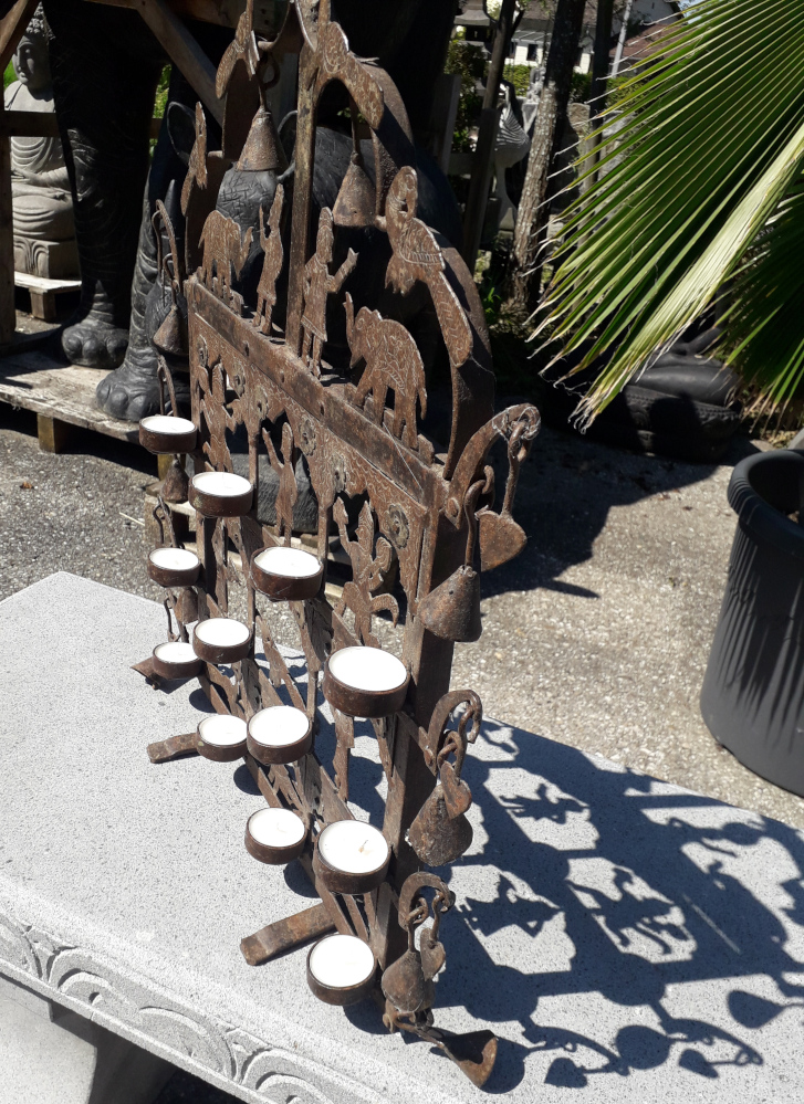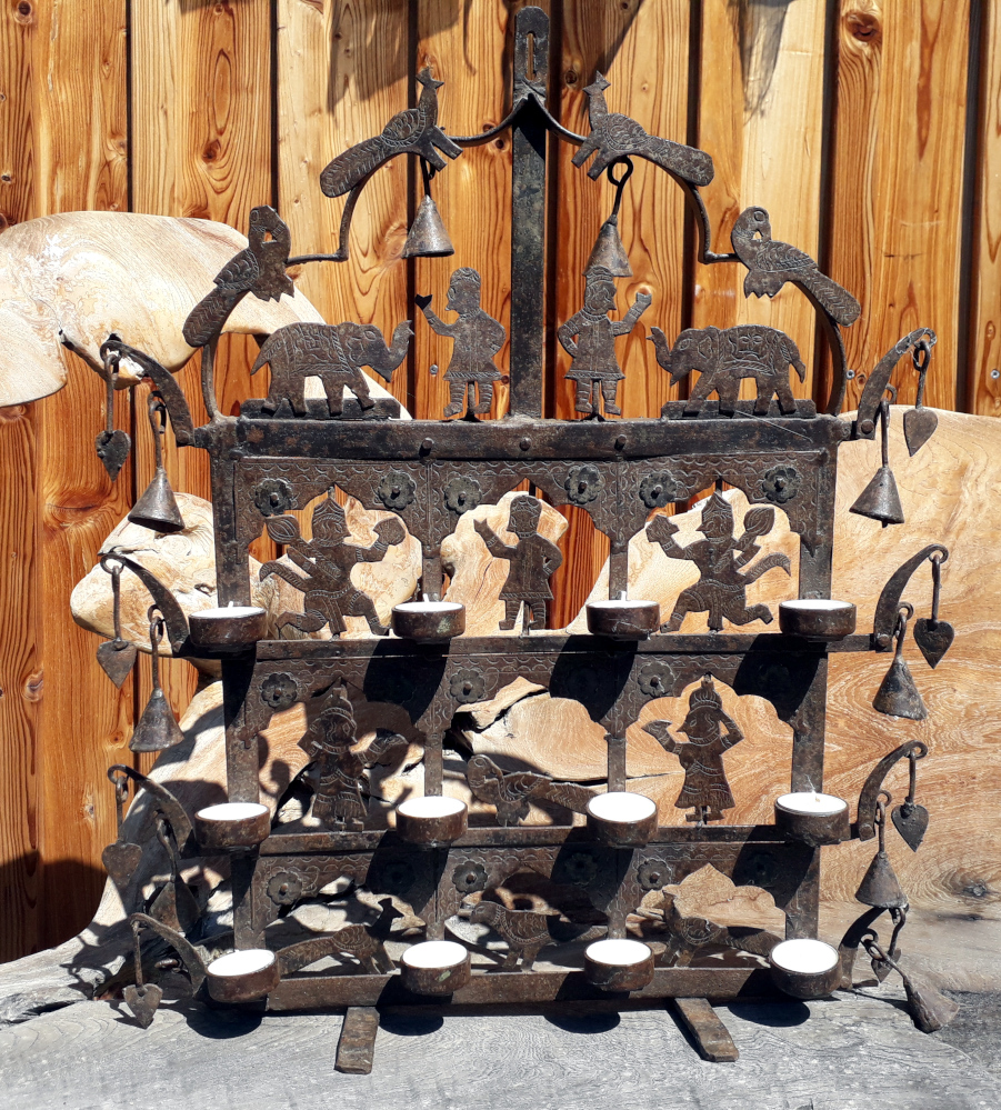 Charmantes Eisenrelief und Kerzenständer in einem: „Toran“ – altes indisches Kunsthandwerk mit Darstellungen von Mensch und Tier, Platz für 12 Teelichter, seitlich verziert mit Glöckchen, zum Hängen oder Aufstellen!