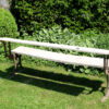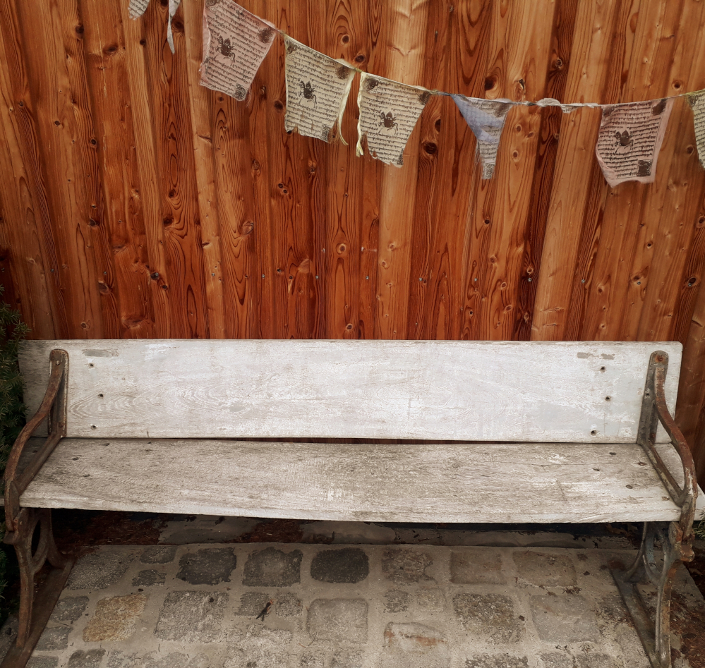 Originelle Wechsel-Gartenbank aus Indien: Die Rückenlehne ist nach vorne klappbar, wodurch man eine bequeme Arm- oder Schreibablage erhält, dei Füße aus Gusseisen, die Sitzfläche massives Holz, Einzelstück