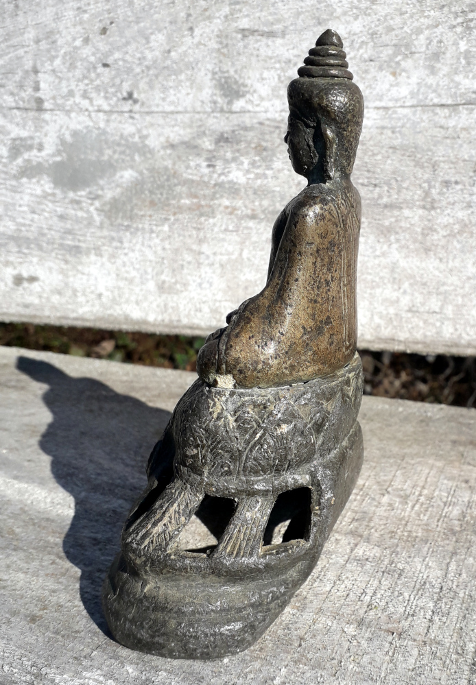 Beeindruckender Buddha aus Bronze, sitzend auf einem Bleisockel, antikes Unikat aus dem Himalaya, ca. 100 Jahre alt, Sammlerstück!