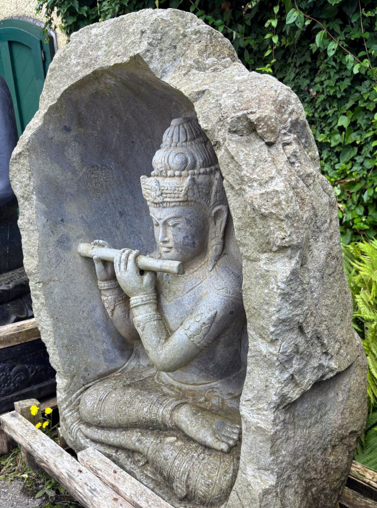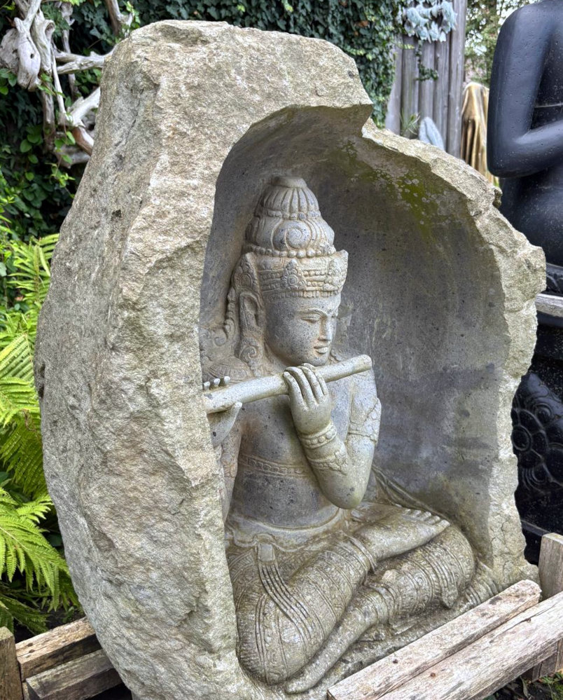 Einzigartig schöne Gartenfigur: Flötenspielender Krishna in einer Höhle aus massivem Flussstein, handgehauenes und frostsicheres Meisterstück aus Indonesien!