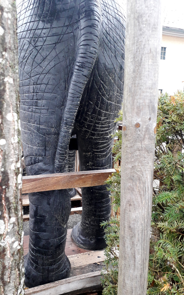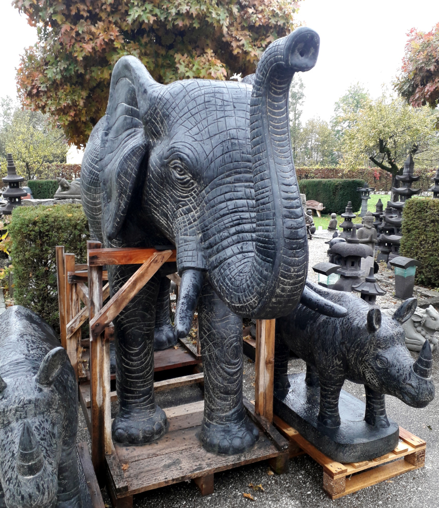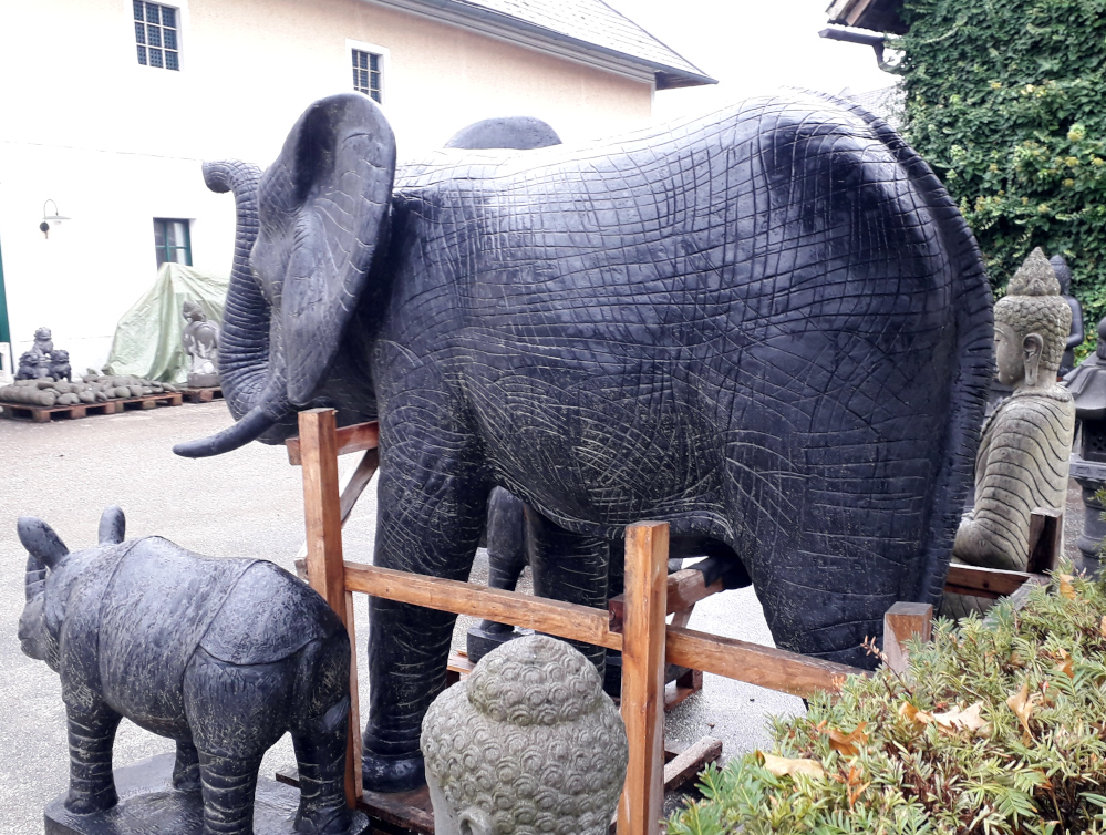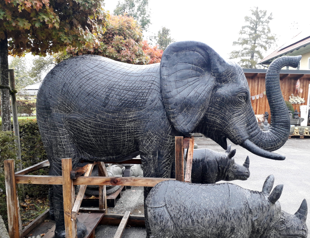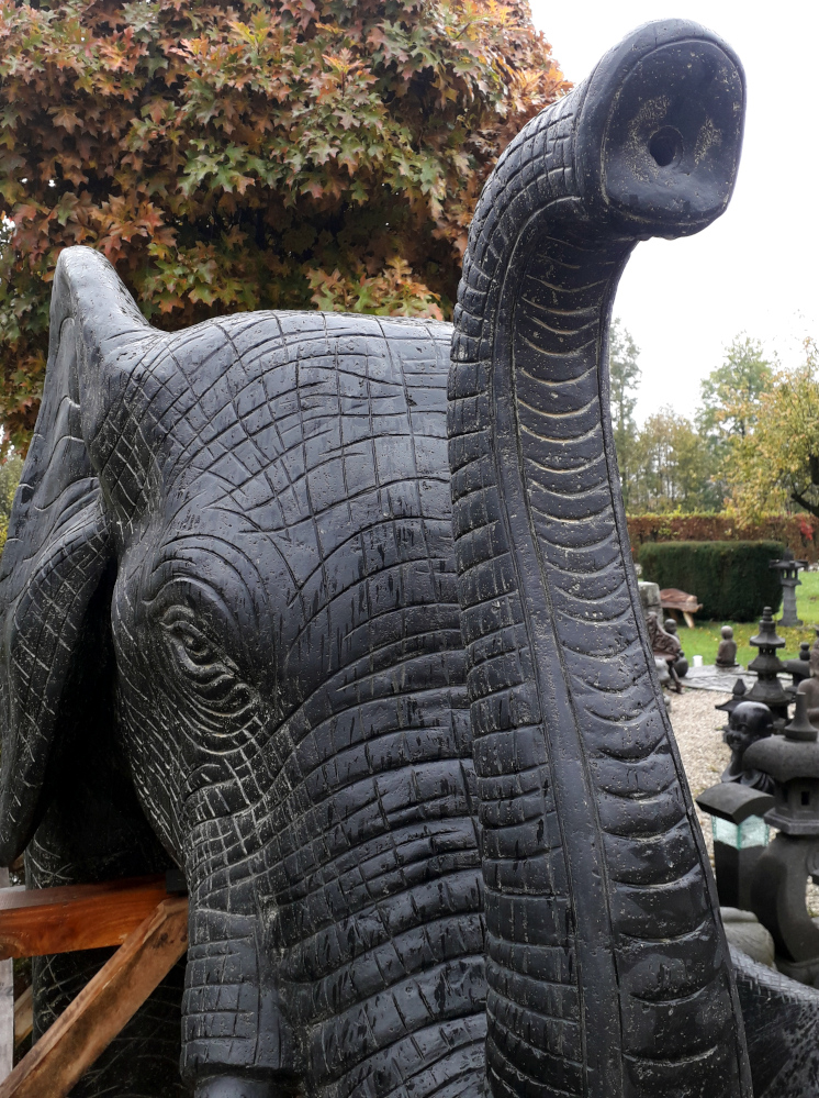 Riesiger Elefant aus frostsicherem Steinguss, lebensechte Darstellung fein modelliert, auch als Springbrunnen zu verwenden – das Wasser spritzt aus dem Rüssel, grossartiger Eyecatcher!