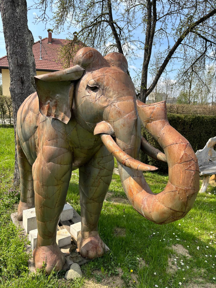 Ein echter Blickfang: Lebensgroßer Glückselefant aus massiven Eisenplatten, handgenietet, Unikat aus Indien!