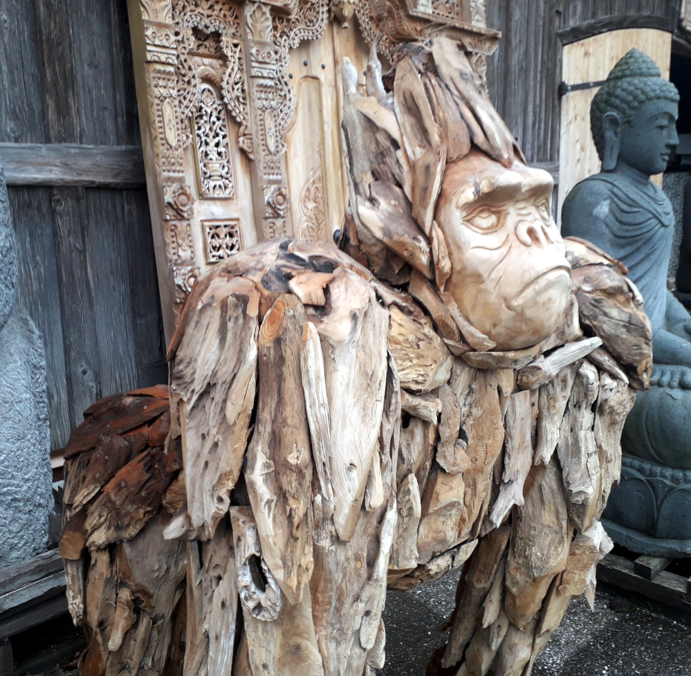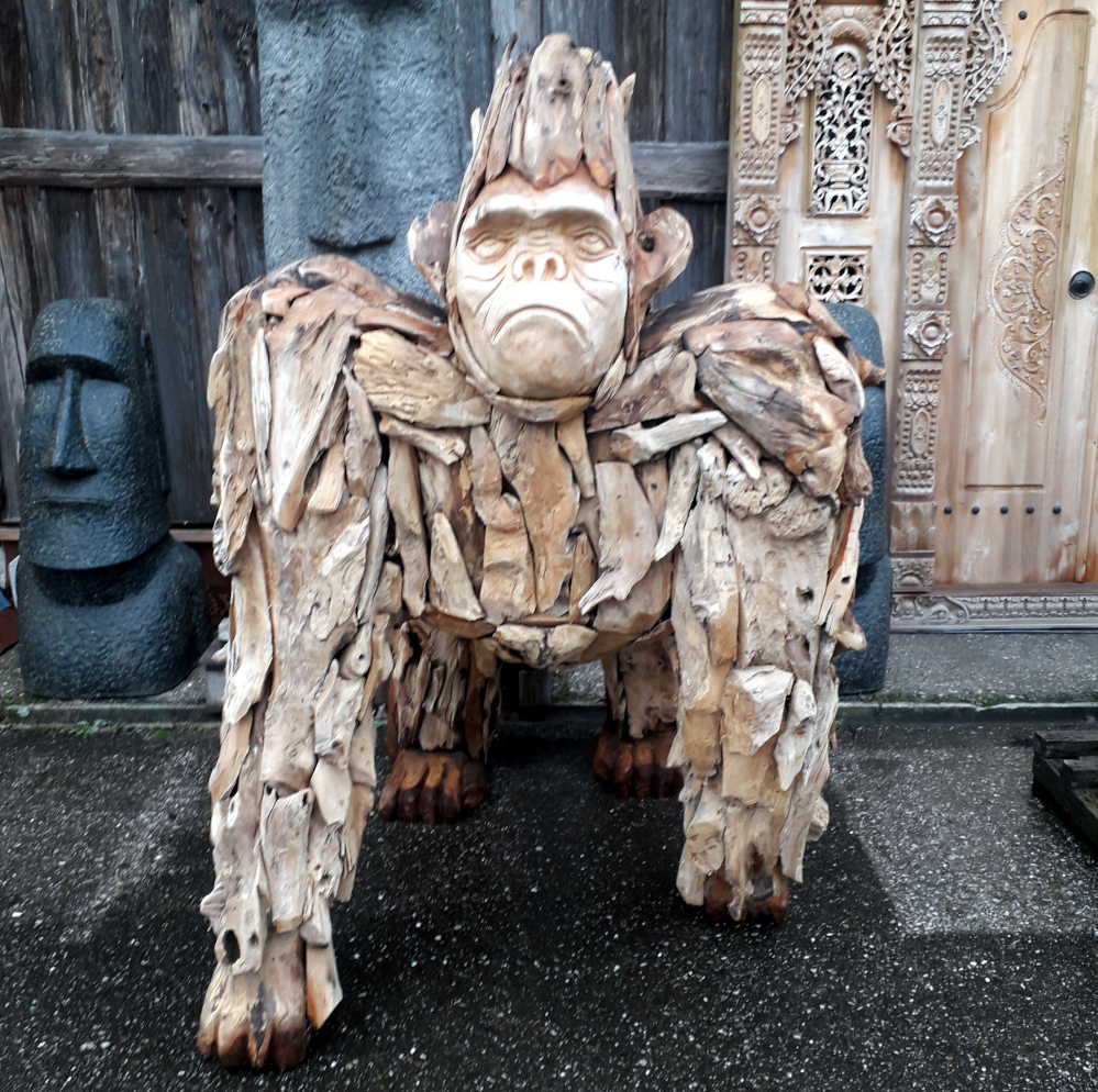 Mächtiger, lebensgrosser Gorilla aus witterungsbeständigem Teakwurzelholz, meisterlich verarbeitet, Eyecatcher und Unikat aus Indonesien!