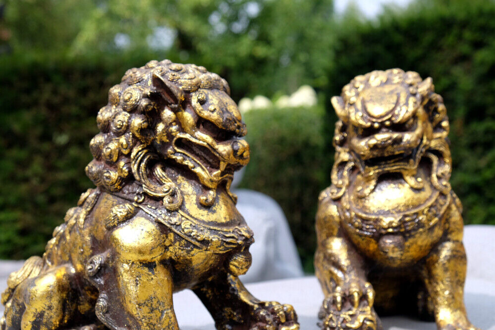 Goldenes Wächterlöwenpaar aus China, aus vergoldetem Eisenguss, nicht nur für Sammler ein schönes Dekorationsobjekt, Paarpreis!