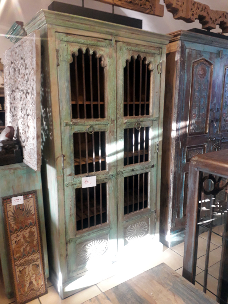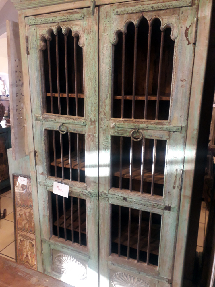 Großer massiver Schrank aus Indien, die beiden Türen mit Gitterstäben versehen, Unikat jetzt in Aktion!
