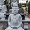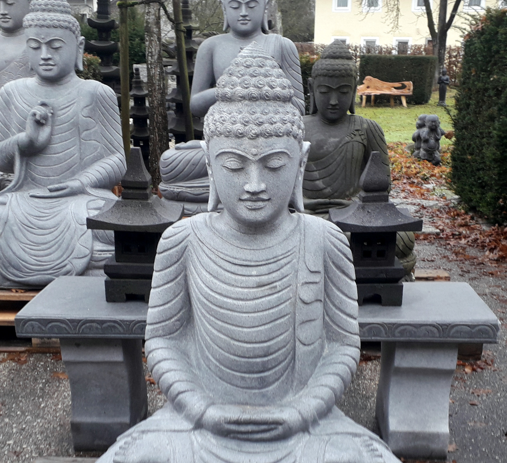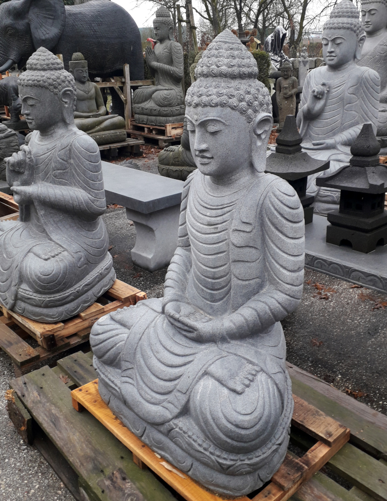 Buddha aus frostsicherem, massivem und handgehauenem Flussstein, die Hände in der „Dhyana Mudra“, die Geste für Meditation, Konzentration und inneren Frieden.