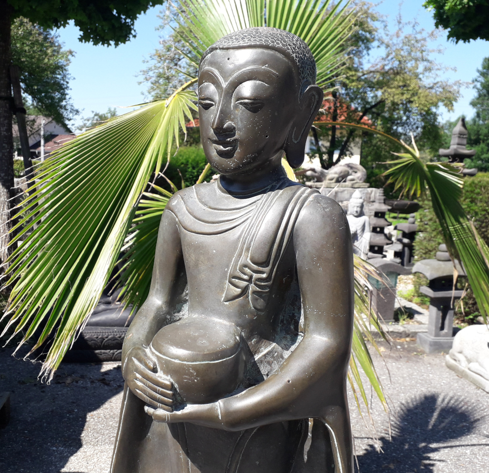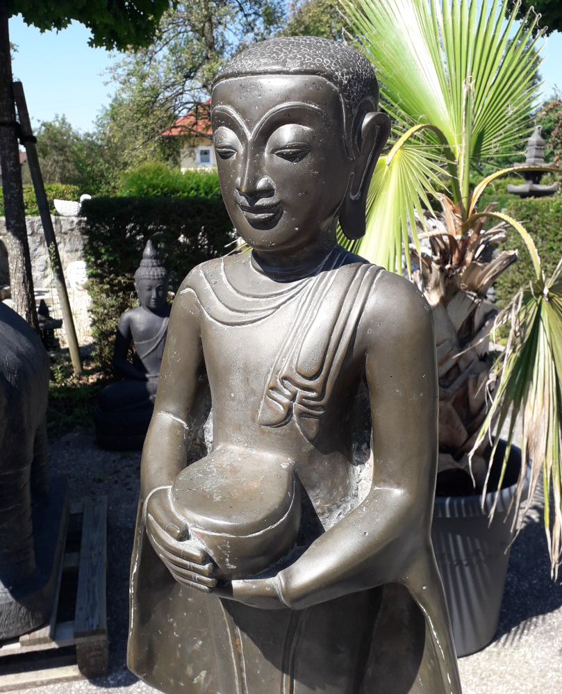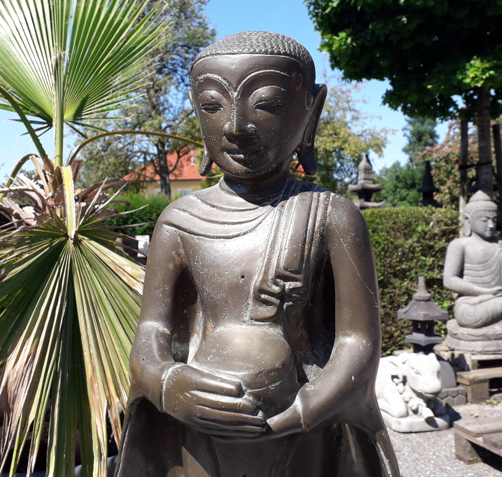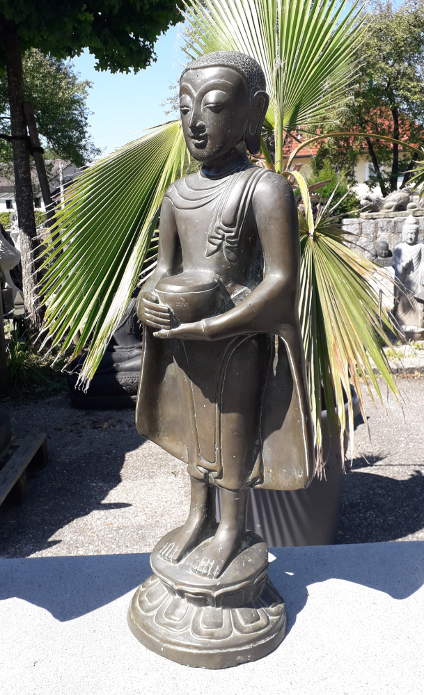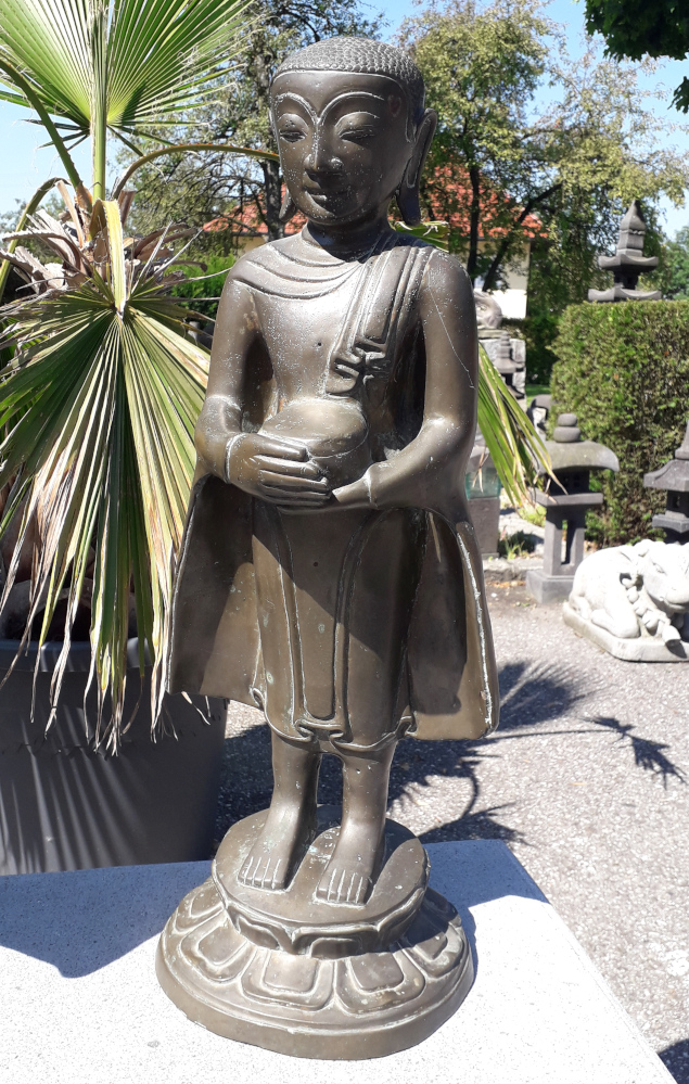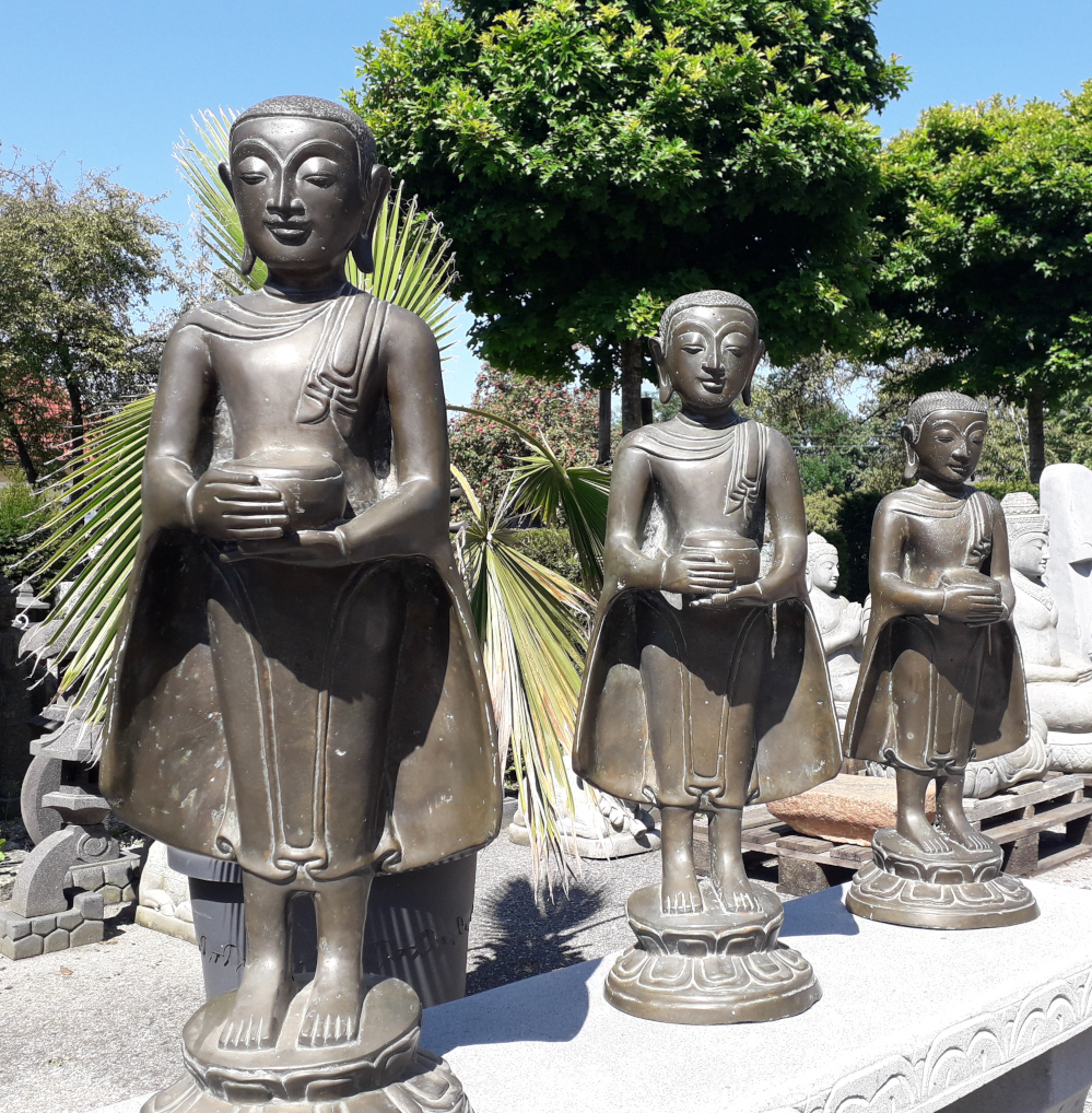 Wunderschöne massive Mönche aus Bronze, alter Guß aus Burma, stehend auf dem Lotussockel, die Füße eng zusammen, in beiden Händen eine Opferschale haltend, nach Buddhas Vorbild repräsentieren sie den „Mittleren Weg“ zwischen der Askese und der Maßlosigkeit, Unikate, 3er-Setpreis!