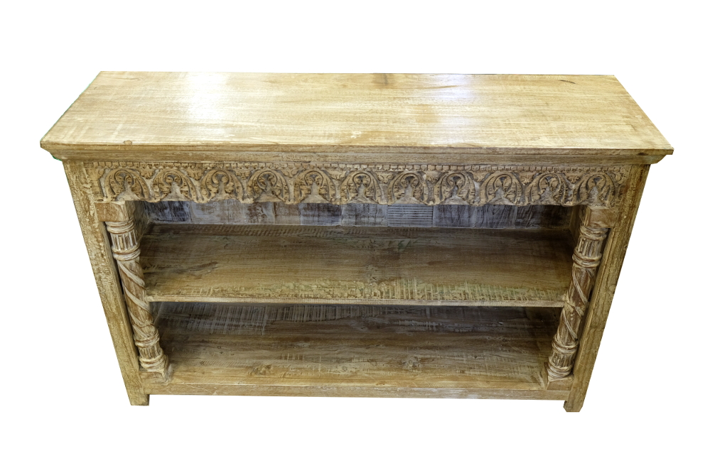 Praktisches Regal aus Indien, zwei Ebenen, handgeschnitzte Front mit Säulen, Unikat!