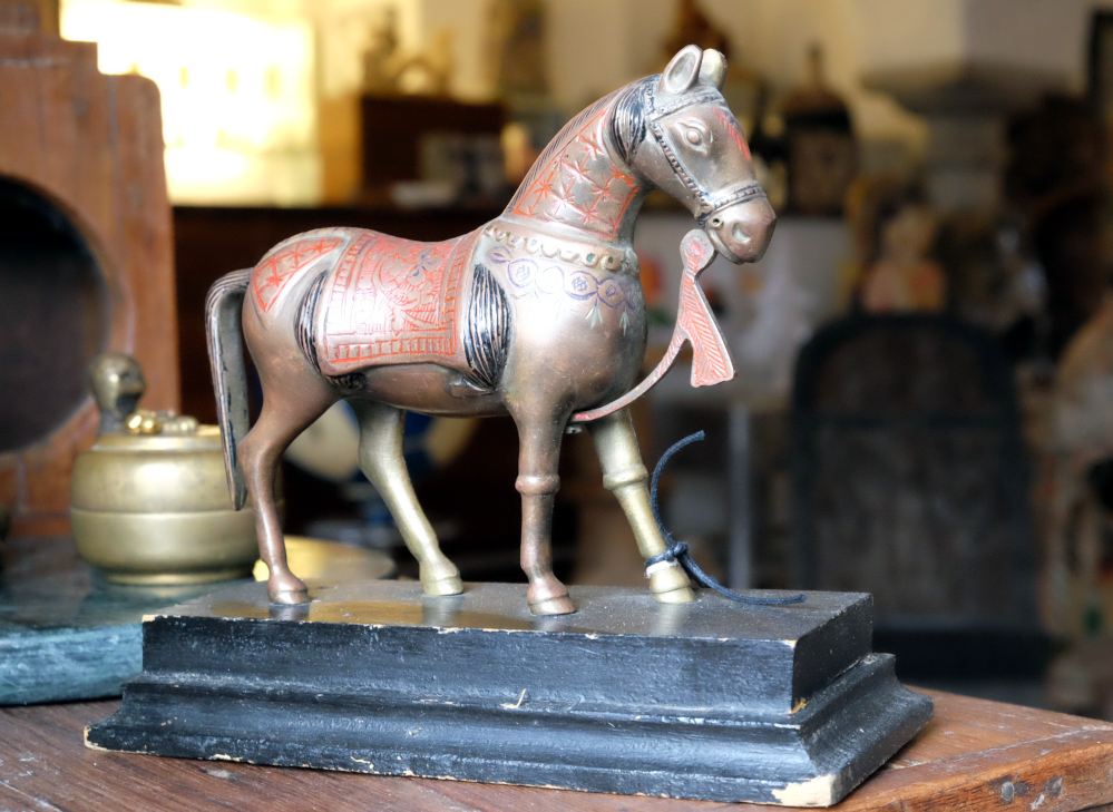 Altes Spielzeug aus Indien: Pferd aus massivem Messing, noch mit den Resten der alten Patina versehen, Unikat.