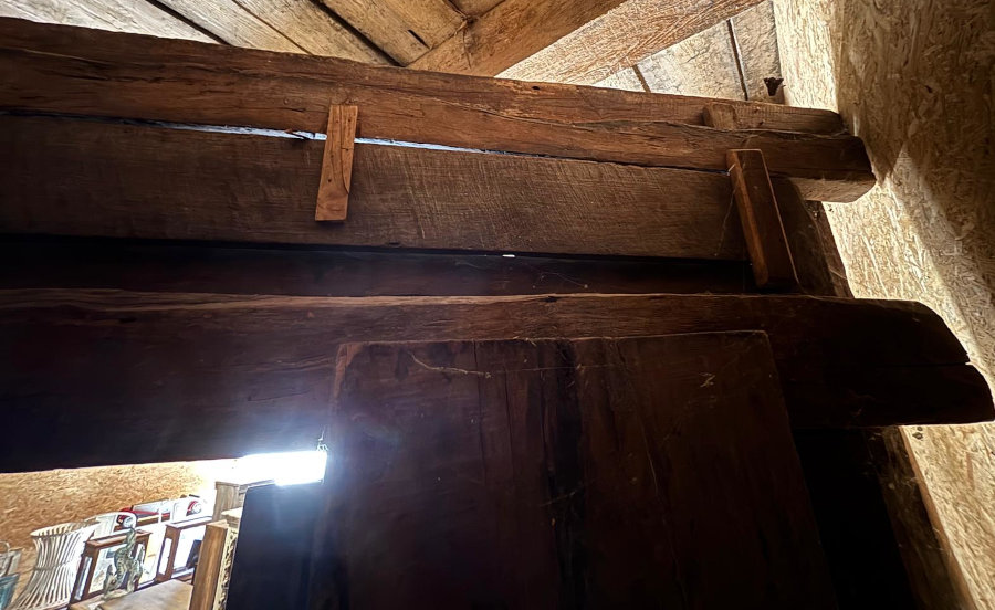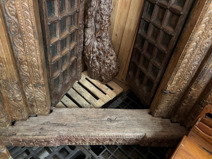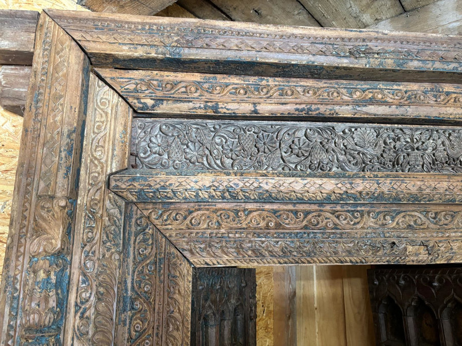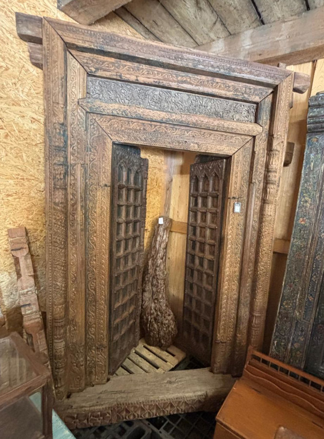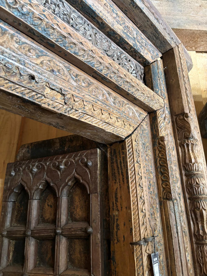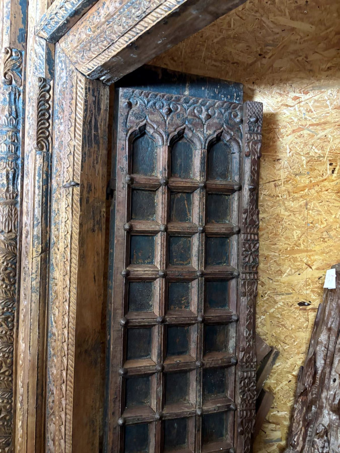 Tolle alte Tür oder besser gesagt: aussergewöhnliches Portal aus massivem Hartholz. Die beschlagenen Doppeltüren gehen nach innen auf, der Rahmen ist liebevoll mit handgeschnitzten Ornamenten verziert, tolle alte Patina, spektakuläres Unikat aus Indien!