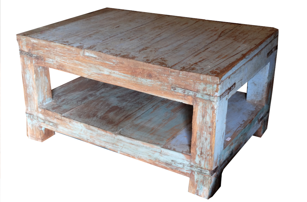 Rustikaler Couchtisch aus Indien, zwei Ebenen, türkisblaue Patina, Einzelstück.