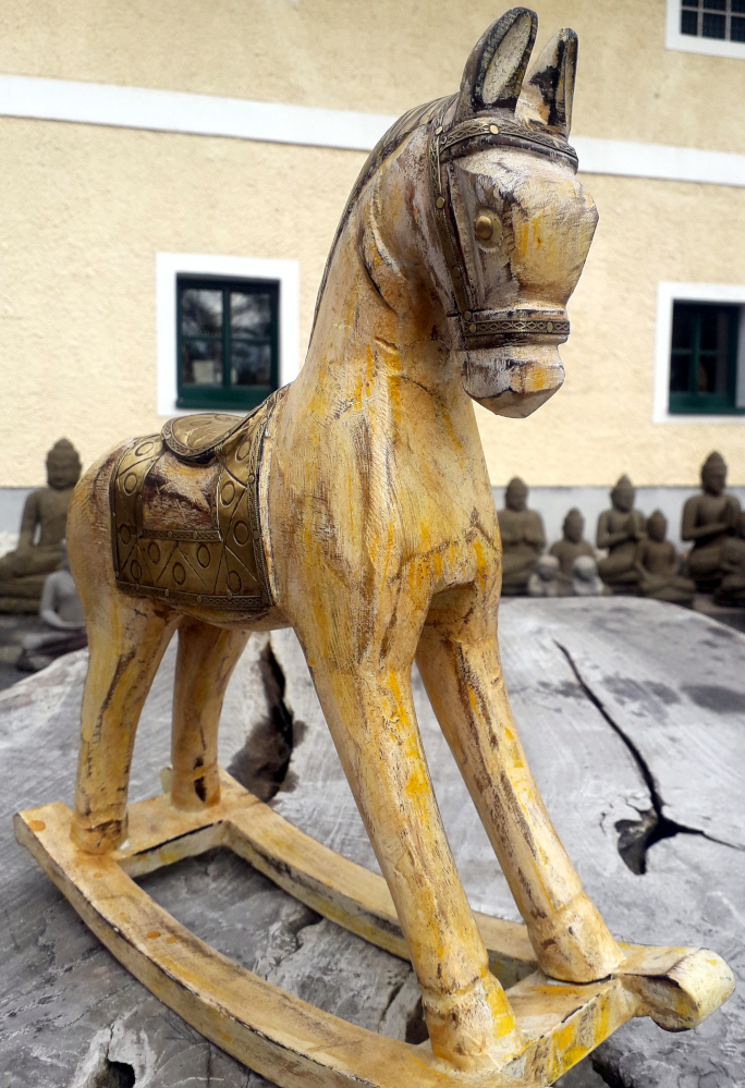 Handgeschnitztes Schaukelpferd aus Indien, Mähne und Sattel messingbeschlagen, nicht nur für Pferdenarren eine schöne Deko, jetzt in Aktion!