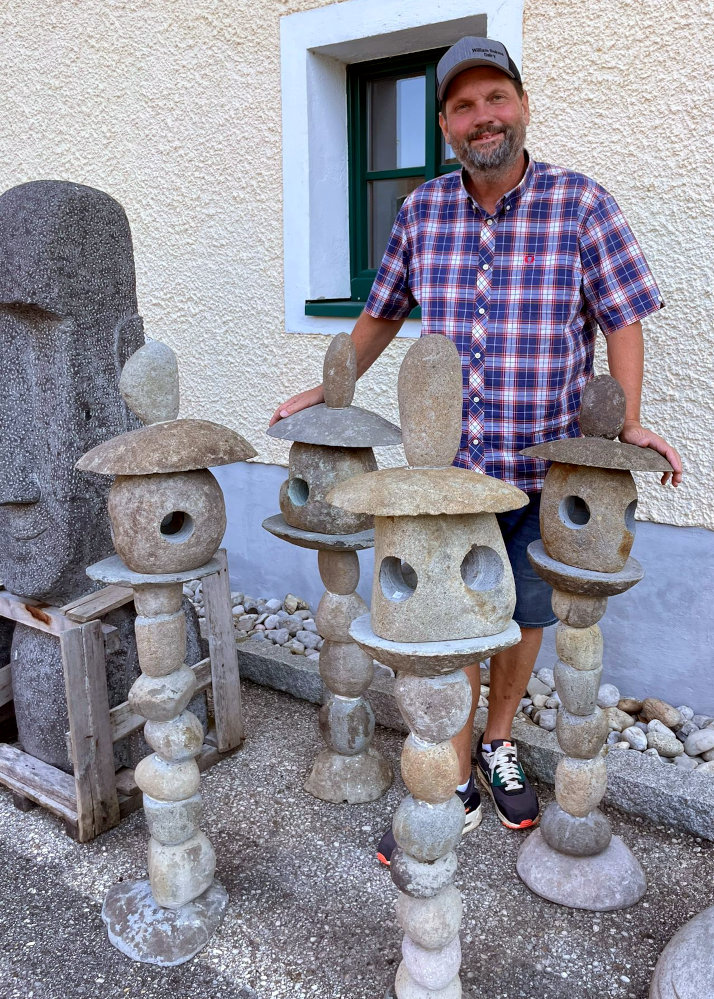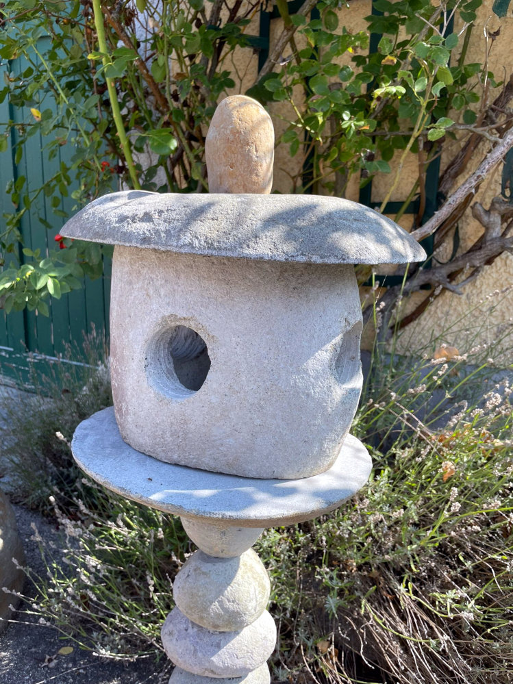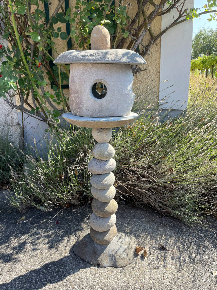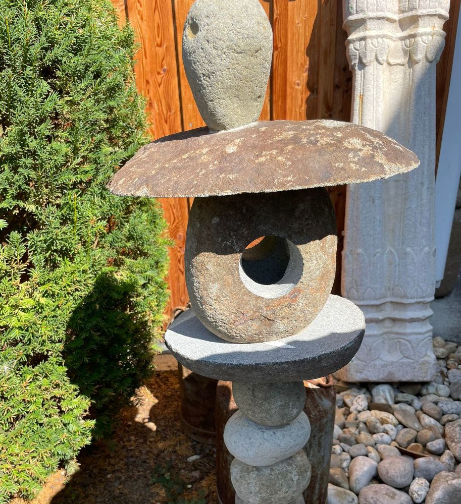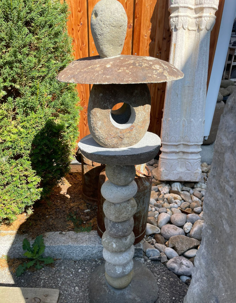 Aus vielen Steinen zusammengesetzte dreiteilige Gartenlaterne mit Kugelkörper und Hut, frostsicherer Flusstein, z.B. mit LED zu beleuchten, letztes Stück jetzt in Aktion!