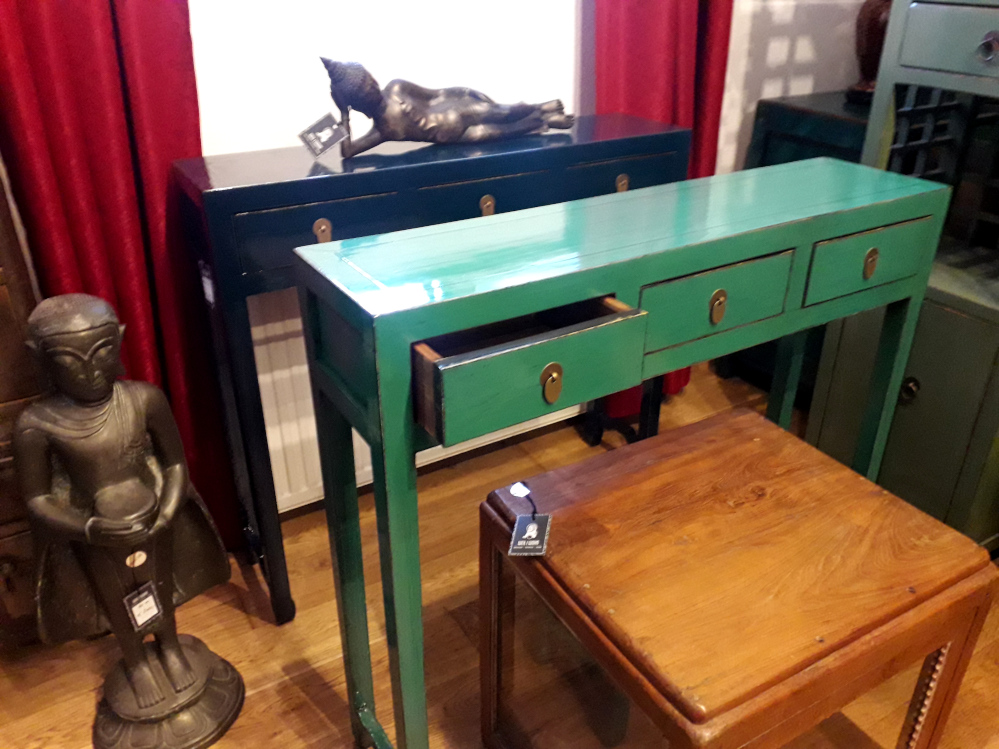 Schmale Konsole aus China, satt lackiert in dunkelblau, wegen der geringen Tiefe praktisch z.B. im Vorraum, letztes Stück in dunkelblau jetzt im Angebot!