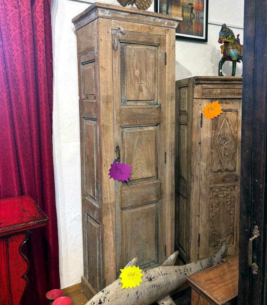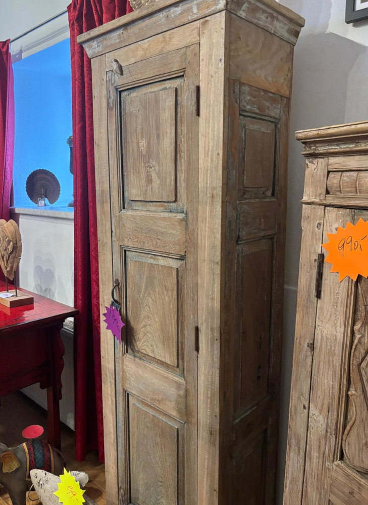 Schmaler Schrank aus Indien, unter den Resten der Patina die schöne Maserung vom Holz, Unikat!