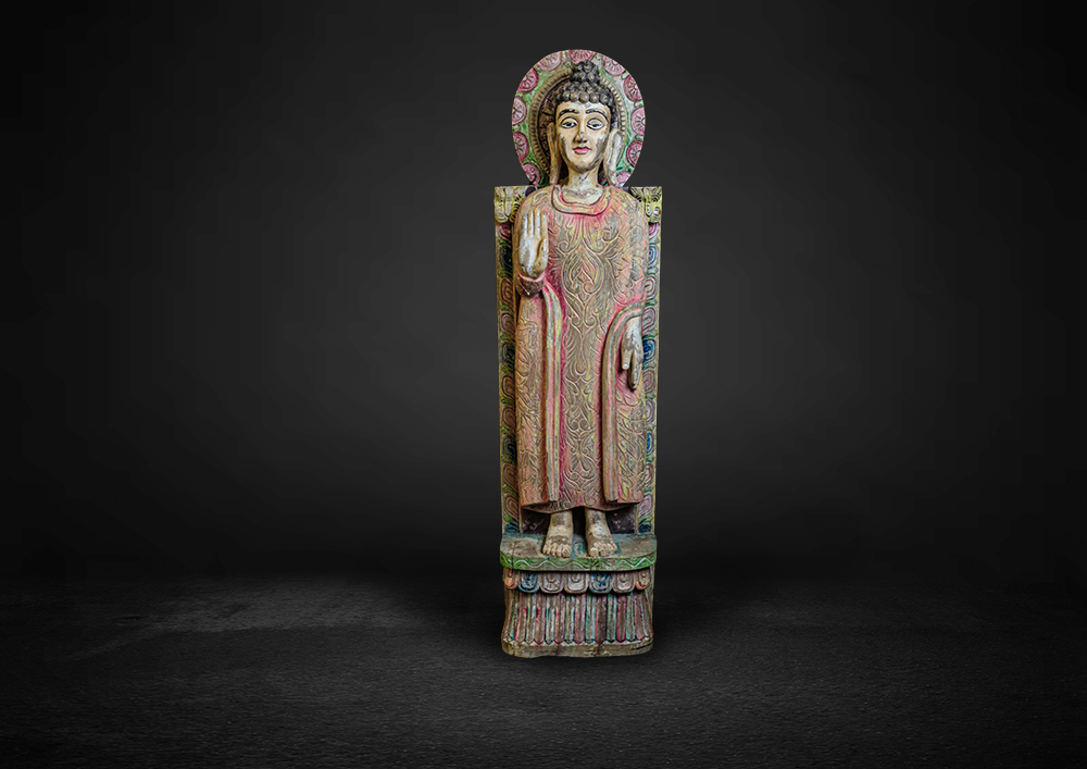 Bunt bemalter stehender Buddha aus Indien, die Handhaltung hält Unheil ab, handgeschnitztes Unikat!