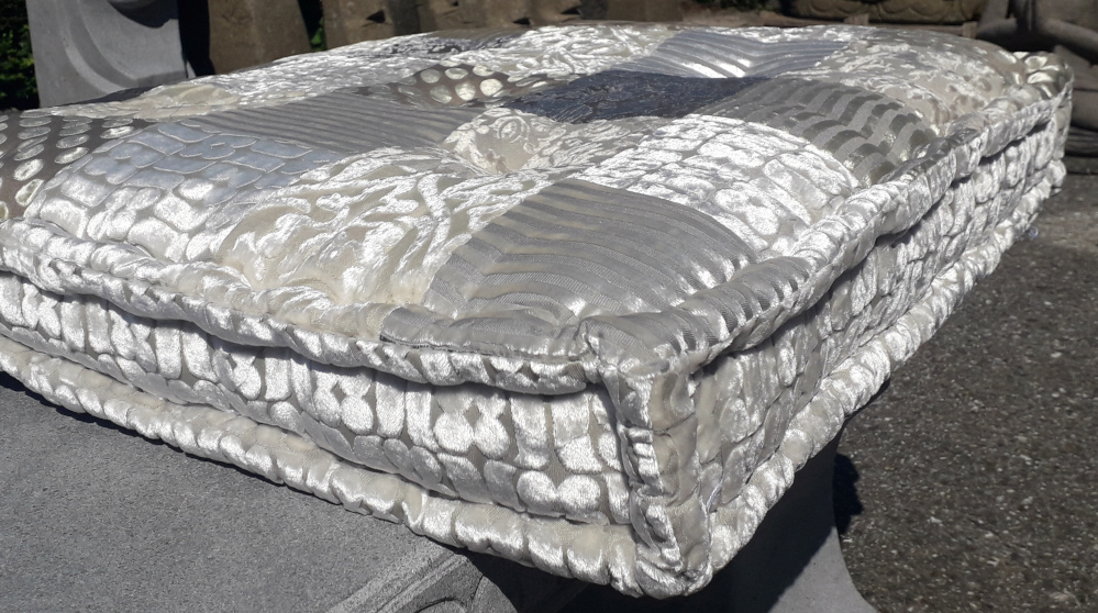 Großes Sitzkissen aus Indien, alter grauer Seidenstoff und bequem durch die Füllung mit der Naturfaser Kapok!
