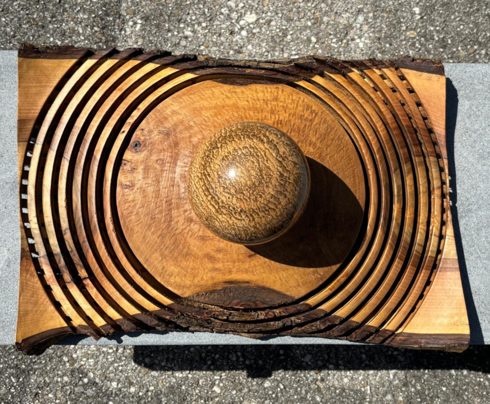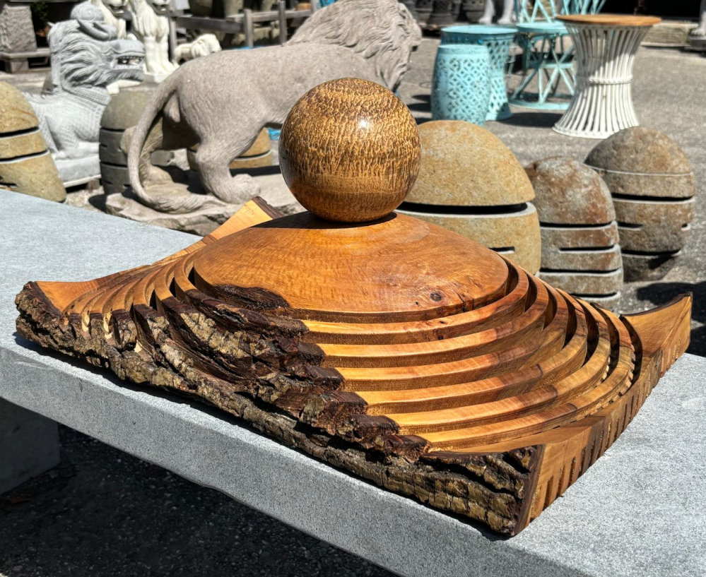 Spektakulär gefertigte Skulptur aus Holz und Stein: als Basis dient das alte charaktervolle Holz mit entgegengesetzten runden und geraden Schnitten, oben thront eine geschliffene Steinkugel, Unikat eines Künstlers aus dem Salzkammergut!
