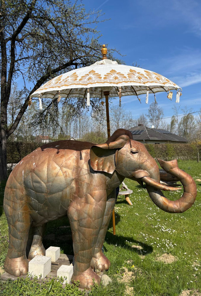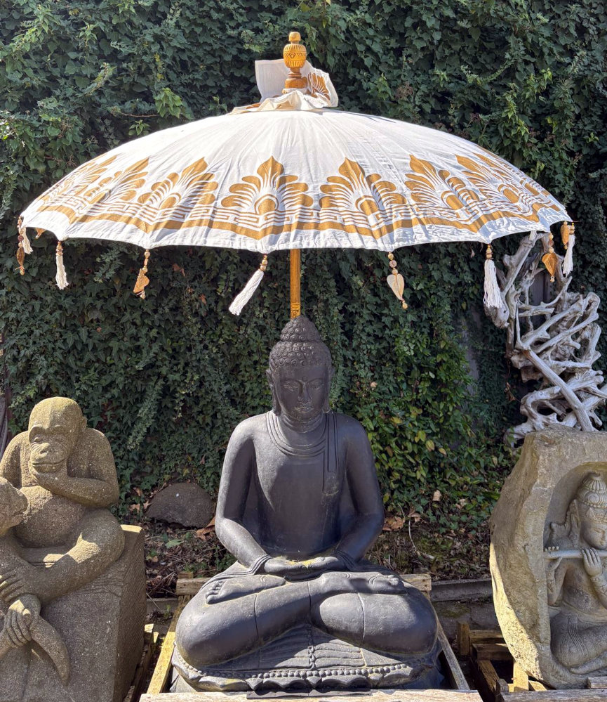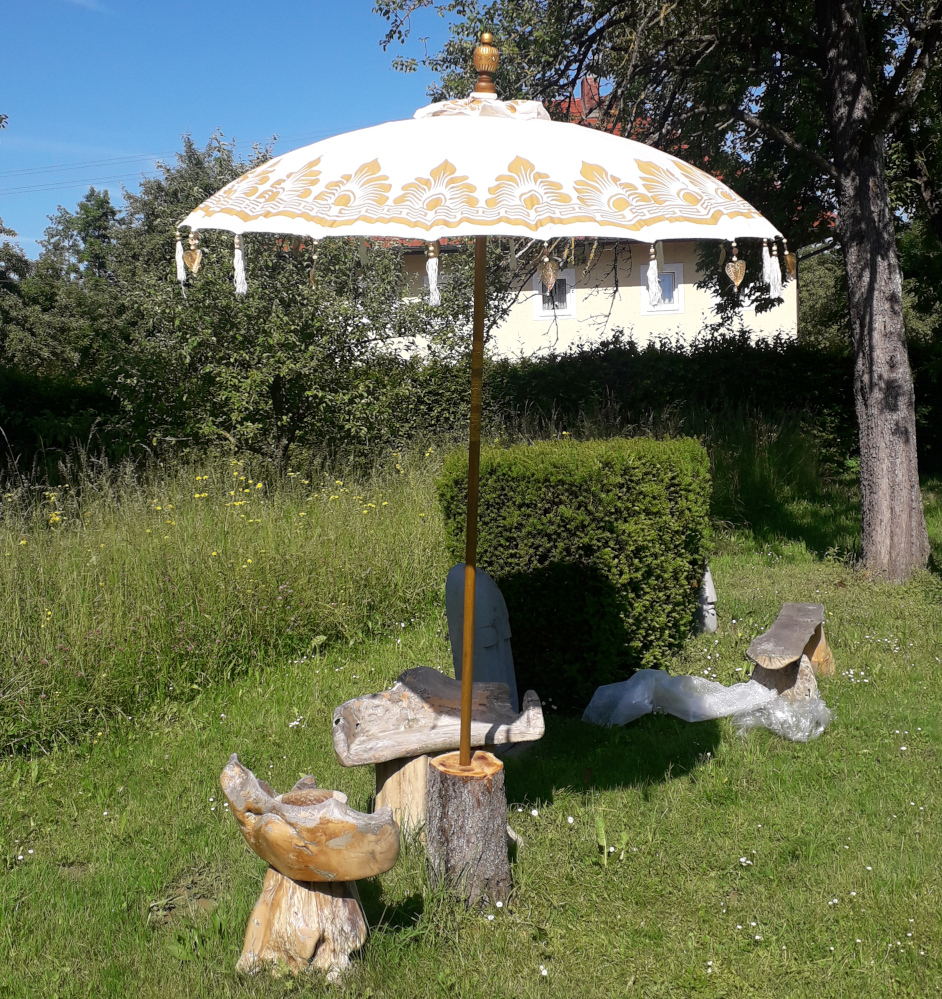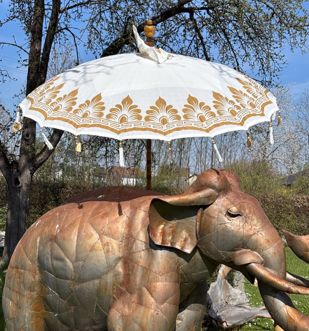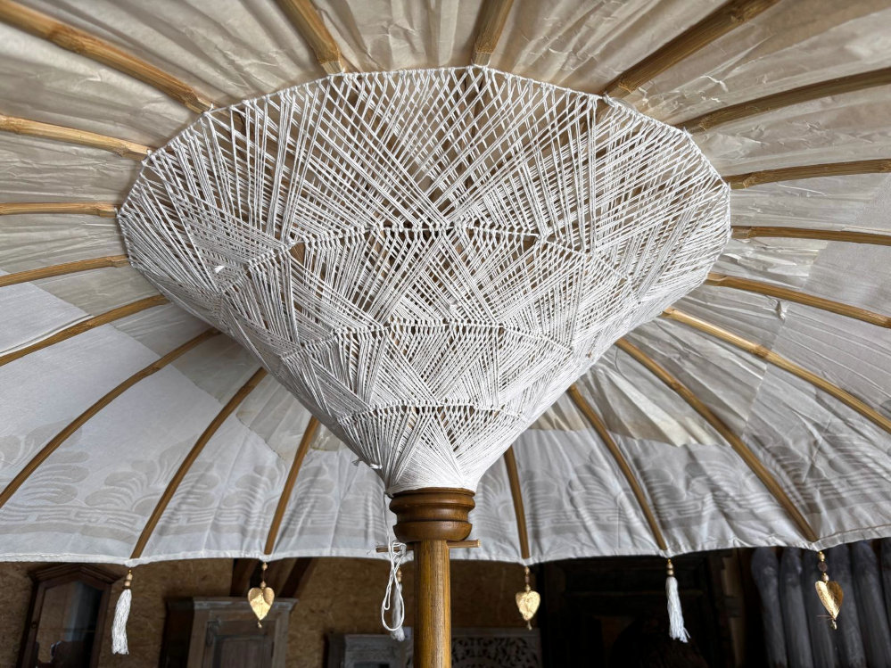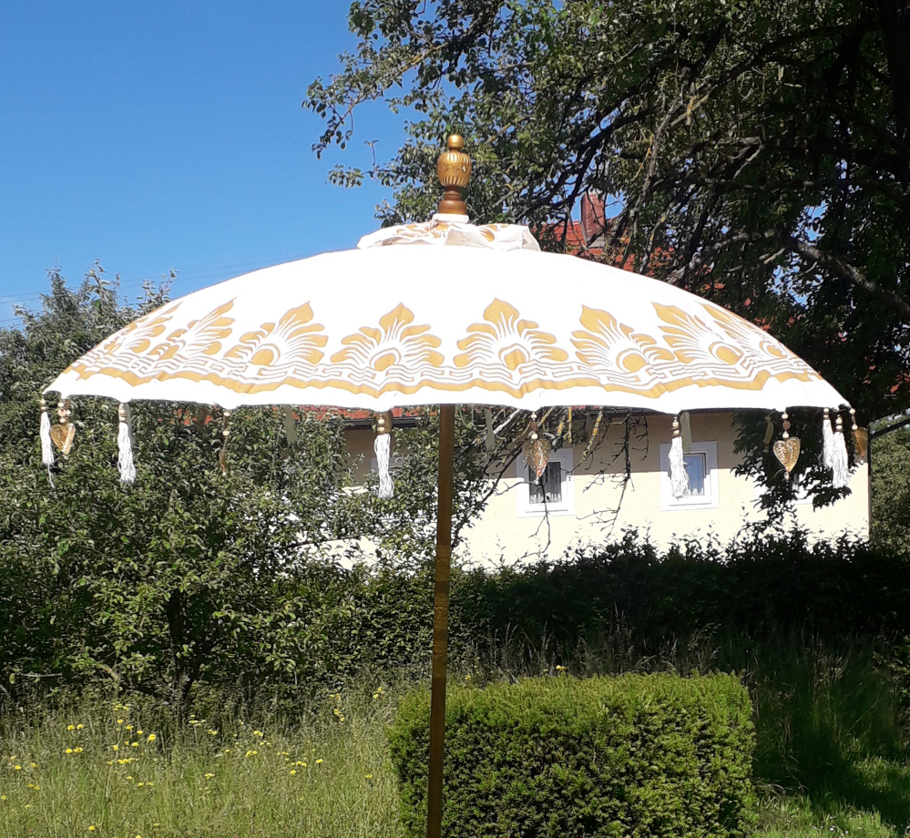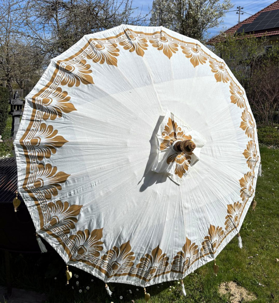 Dieser großartige handgefertigte Sonnenschirm verbreitet asiatisches Boho Flair- ideal für Garten, Balkon und Terrasse!
