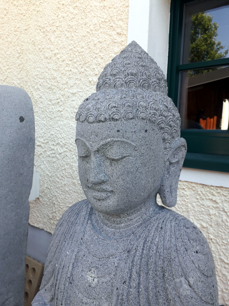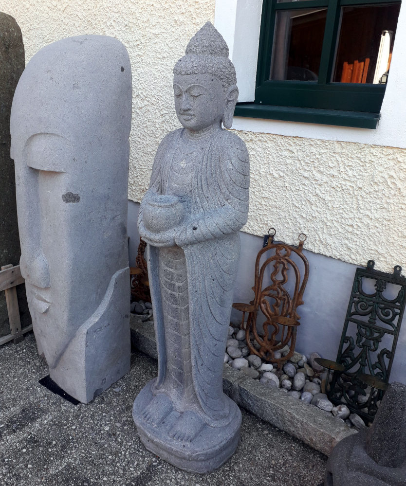 Grosser und grossartiger stehender Buddha aus Flussstein, 150 cm, frostsicherer Eyecatcher, von Meisterhand handgehauenes Unikat aus Indonesien!