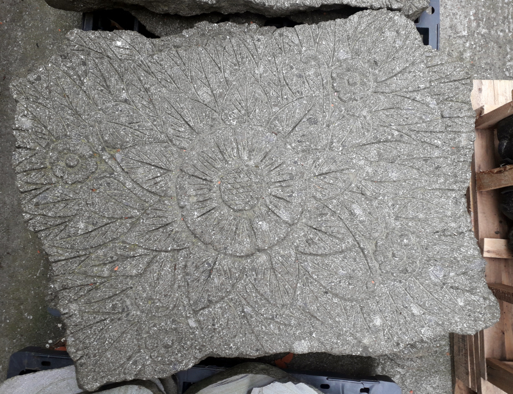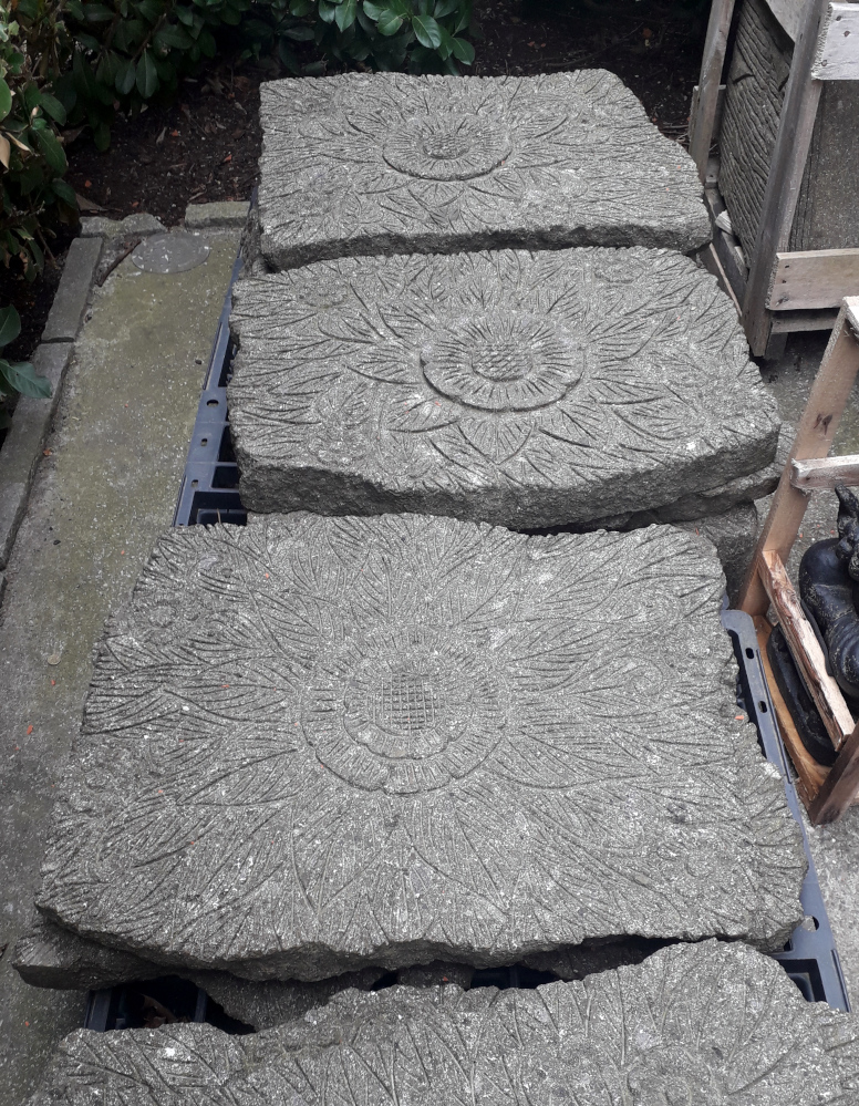 Wieder da: Steinplatten aus frostsicherem Lavastein, eingraviert eine stilisierte Lotusblüte, gut geeignet z.B. für einen Gartenweg oder als Zierplatte, Symbolfotos – da jedes Stück ein Einzelstück!