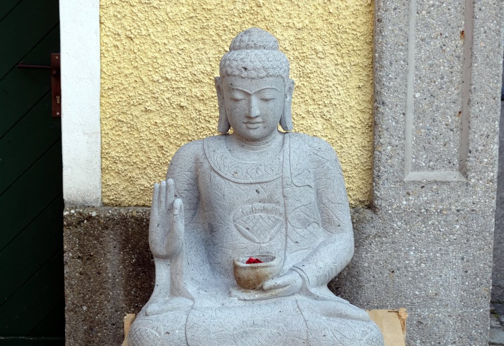 Buddha aus frostsicherem Flussstein, sitzend auf einem Lotussockel. Die Hände sind in der lehrenden Haltung (Mudra). Blickfang und Unikat aus Indonesien.